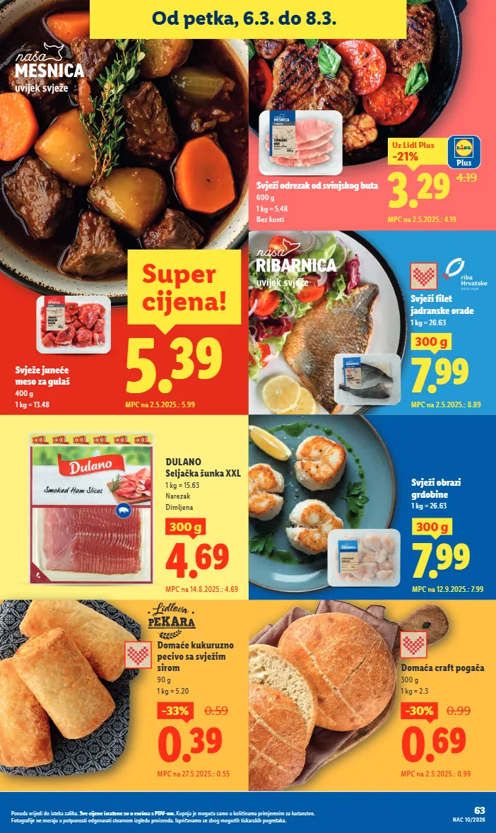 Svježi filet jadranske orade 1 kg = 26.63 4.69 300 g MPC na 14.8.2025.: 4.69 DULANO Seljačka šunka XXL 1 kg = 15.63 Narezak Dimljena Domaće kukuruzno pecivo sa svježim sirom 90 g 1 kg = 5.20 0.39 -33% 0.59 MPC na 27.5.2025.: 0.55 Svježi odrezak od svinjskog buta 600 g 1 kg = 5.48 Bez kosti 4.19 3.29 -21% Uz Lidl Plus MPC na 2.5.2025.: 4.19 Svježe juneće meso za gulaš 400 g 1 kg = 13.48 5.39 MPC na 2.5.2025.: 5.99 Super cijena! 0.69 -30% 0.99 MPC na 2.5.2025.: 0.99 Domaća craft pogača 300 g 1 kg = 2.3 7.99 300 g MPC na 2.5.2025.: 8.89 7.99 300 g MPC na 12.9.2025.: 7.99 Svježi obrazi grdobine 1 kg = 26.63 63 NAC 10/2026 Ponuda vrijedi do isteka zaliha. Sve cijene izražene su u eurima s PDV-om. Kupnja je moguća samo u količinama primjerenim za kućanstvo. Fotografije ne moraju u potpunosti odgovarati stvarnom izgledu proizvoda. Ispričavamo se zbog mogućih tiskarskih pogrešaka. Od petka, 6.3. do 8.3.