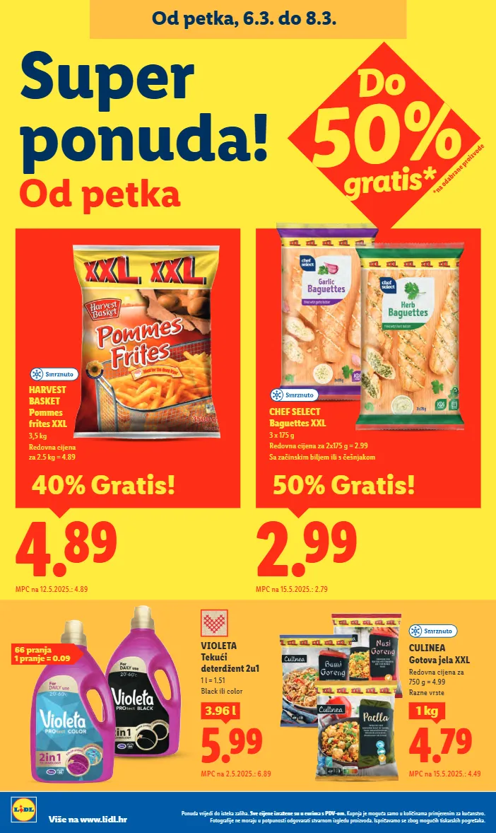 super ponuda! od petka culinea gotova jela xxl redovna cijena za 750 g = 4.99 razne vrste 4.89 harvest basket pommes frites xxl 3,5 kg redovna cijena za 2.5 kg = 4.89 mpc na 12.5.2025.: 4.89 40% gratis! 2.99 chef select baguettes xxl 3 x 175 g redovna cijena za 2x175 g = 2.99 sa začinskim biljem ili s češnjakom mpc na 15.5.2025.: 2.79 50% gratis! 4.79 1 kg mpc na 15.5.2025.: 4.49 violeta tekući deterdžent 2u1 1 l = 1.51 black ili color 66 pranja 1 pranje = 0.09 5.99 3.96 l mpc na 2.5.2025.: 6.89 do 50% gratis* *na odabrane proizvode od petka, 6.3. do 8.3. ponuda vrijedi do isteka zaliha. sve cijene izražene su u eurima s pdv-om. kupnja je moguća samo u količinama primjerenim za kućanstvo. fotografije ne moraju u potpunosti odgovarati stvarnom izgledu proizvoda. ispričavamo se zbog mogućih tiskarskih pogrešaka. više na www.lidl.hr