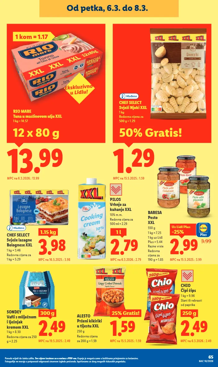 sondey vafli s mliječnom i lješnjak kremom xxl 1 kg = 8.30 redovna cijena za 250 g = 2.25 baresa pesto xxl 550 g 1 kg = 7.25 1 kg uz lidl plus = 5.44 razne vrste redovna cijena za 190 g = 1.85 chef select svježe lasagne bolognese xxl 1 kg = 3.46 redovna cijena za 1 kg = 5.29 chio čipi čips 1 kg = 9.96 slani ili rebrasti od paprike 1.59 25% gratis! mpc na 15.5.2025.: 1.59 1.29 mpc na 15.5.2025.: 1.59 50% gratis! chef select svježi njoki xxl 1 kg redovna cijena za 500 g = 1.29 13.99 mpc na 6.3.2026.: 13.99 12 x 80 g rio mare tuna u maslinovom ulju xxl 1 kg = 14.57 3.99 2.99 -25% uz lidl plus mpc na 15.5.2025.: 3.99 2.49 300 g mpc na 19.5.2025.: 2.49 2.49 250 g mpc na 6.3.2026.: 2.49 921, 922 alesto prženi kikiriki u tijestu xxl 250 g redovna cijena za 200 g = 1.59 3.98 1.15 kg mpc na 16.5.2025.: 3.98 ekskluzivno u lidlu! 1 kom = 1.17 pilos vrhnje za kuhanje xxl 10% m.m. redovna cijena za 500 ml = 2.29 2.79 1 l mpc na 6.3.2026.: 2.79 od petka, 6.3. do 8.3. 65 nac 10/2026 ponuda vrijedi do isteka zaliha. sve cijene izražene su u eurima s pdv-om. kupnja je moguća samo u količinama primjerenim za kućanstvo. fotografije ne moraju u potpunosti odgovarati stvarnom izgledu proizvoda. ispričavamo se zbog mogućih tiskarskih pogrešaka.