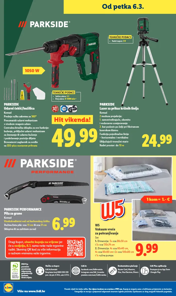 lidl plus aplikacija dostupna je na app store i google play lidl.hr facebook.com/lidlhrvatska instagram.com/lidl_hrvatska youtube.com/user/lidlhrvatska beskontaktno plaćanje master card, maestro, visa, visa electron, diners služba za kupce lidl.hr/kontakt besplatan broj 0800 200 220 pon. do pet. 8-18 h, sub. 8-14 h pefc/56-31-06 pefc certificirano lidl letak iz šuma kojima se održivo gospodari, recikliranih i kontroliranih izvora pefc® je posvećen promicanju odgovornog gospodarenja šumama širom svijeta. od petka 31.10. ponuda vrijedi do isteka zaliha. sve cijene izražene su u eurima s pdv-om. kupnja je moguća samo u količinama primjerenim za kućanstvo. fotografije ne moraju u potpunosti odgovarati stvarnom izgledu proizvoda. ispričavamo se zbog mogućih tiskarskih pogrešaka. više na www.lidl.hr lidl plus aplikacija dostupna je na app store i google play lidl.hr facebook.com/lidlhrvatska instagram.com/lidl_hrvatska youtube.com/user/lidlhrvatska beskontaktno plaćanje master card, maestro, visa, visa electron, diners služba za kupce lidl.hr/kontakt besplatan broj 0800 200 220 pon. do pet. 8-18 h, sub. 8-14 h pefc/56-31-06 pefc certificirano lidl letak iz šuma kojima se održivo gospodari, recikliranih i kontroliranih izvora pefc® je posvećen promicanju odgovornog gospodarenja šumama širom svijeta. kupnju obavi na vrijeme jer u nedjelju, 30.1. naše trgovine neće raditi. skeniraj qr kod za više informacija o radnom vremenu vaše trgovine. lidl plus aplikacija dostupna je na app store i google play lidl.hr facebook.com/lidlhrvatska instagram.com/lidl_hrvatska youtube.com/user/lidlhrvatska beskontaktno plaćanje master card, maestro, visa, visa electron, diners služba za kupce lidl.hr/kontakt besplatan broj 0800 200 220 pon. do pet. 8-18 h, sub. 8-14 h pefc/56-31-06 pefc certificirano lidl letak iz šuma kojima se održivo gospodari, recikliranih i kontroliranih izvora pefc® je posvećen promicanju odgovornog gospodarenja šumama širom svijeta. lidl plus aplikacija dostupna je na app store i google play lidl.hr facebook.com/lidlhrvatska instagram.com/lidl_hrvatska youtube.com/user/lidlhrvatska beskontaktno plaćanje master card, maestro, visa, visa electron, diners služba za kupce lidl.hr/kontakt besplatan broj 0800 200 220 pon. do pet. 8-18 h, sub. 8-13 h pefc/56-31-06 pefc certificirano lidl letak iz šuma kojima se održivo gospodari, recikliranih i kontroliranih izvora pefc® je posvećen promicanju odgovornog gospodarenja šumama širom svijeta. 6.99 parkside performance pila za grane komad visokokvalitetni nož od karbonskog čelika dužina lista pile: cca 31 cm ili cca 21 cm sklopiva ili sa zaštitom za nož parkside udarni čekić/bušilica komad prednja ručka zakretna za 360° pneumatski udarni mehanizam s visokom snagom udara centralna biračka sklopka za sve funkcije: bušenje, priključni udarni mehanizam za štemanje ili udarno bušenje i podešavanje pozicije dlijeta brzozatezni zaglavnik za svrdlo sa sds-plus sustavom prihvata 49.99 h it vikenda ! 24.99 parkside laser za prikaz križnih linija komad 2 modusa projekcije: 1. samonivelirajuće, okomito i vodoravno usmjeravanje 2. kut podesiv po želji pri fiksiranom laserskom klatnu funkcija pojedinačne linije – horizontalno i vertikalno uključujući tronožni stativ radni prostor: do 10 m 9.99 w5 vakuum vreće za pohranjivanje set 1. dimenzije: 5x cca 86x50 cm i 5x cca 130x74 cm 2. dimenzije: 4x cca 60x40 cm, 4x cca 80x60 cm i 2x cca 100x80 cm i 1x ručna pumpa 1050 w tehnički podaci • jačina udara: 3 j • broj udara: 0-5300 min-¹ dragi kupci, obavite kupnju na vrijeme jer će u nedjelju, 8.3. samo neke naše trgovine raditi. skeniraj qr kod za više informacija o radnom vremenu vaše trgovine. 1 kom = 1.- € tehnički podaci • radni napon: 3 v od petka 6.3. ponuda vrijedi do isteka zaliha. sve cijene izražene su u eurima s pdv-om. kupnja je moguća samo u količinama primjerenim za kućanstvo. fotografije ne moraju u potpunosti odgovarati stvarnom izgledu proizvoda. ispričavamo se zbog mogućih tiskarskih pogrešaka. više na www.lidl.hr