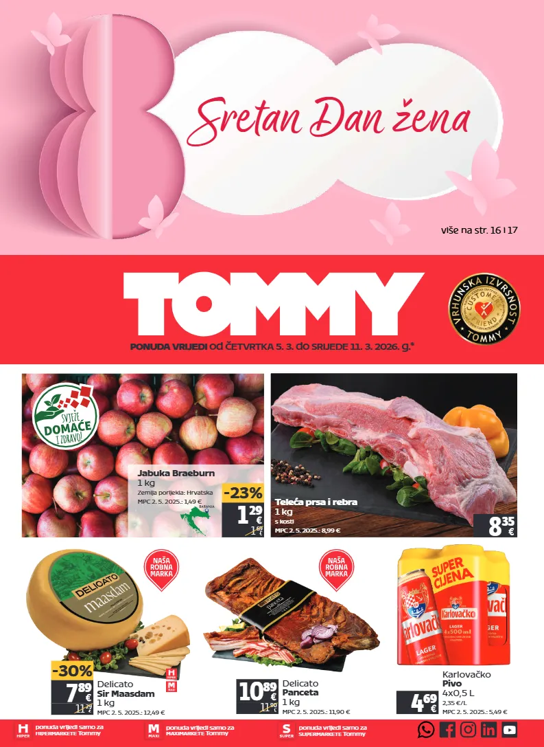 whatsapp - prati nas i još brže saznaj novosti 1 ponuda vrijedi samo za maximarkete tommy ponuda vrijedi samo za hipermarkete tommy ponuda vrijedi samo za supermarkete tommy ponuda vrijedi od četvrtka 5. 3. do srijede 11. 3. 2026. g.* 7 89 11 29 -30% delicato sir maasdam 1 kg mpc 2. 5. 2025.: 12,49 € 10 89 11 90 delicato panceta 1 kg mpc 2. 5. 2025.: 11,90 € karlovačko pivo 4x0,5 l 2,35 €/l mpc 2. 5. 2025.: 5,49 € 4 69 jabuka braeburn 1 kg zemlja porijekla: hrvatska mpc 2. 5. 2025.: 1,49 € 1 29 1 69 -23% sretan dan žena više na str. 16 i 17 8 35 teleća prsa i rebra 1 kg s kosti mpc 2. 5. 2025.: 8,99 €