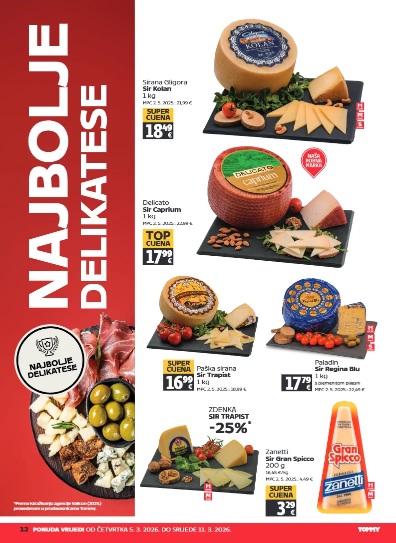*prema istraživanju agencije valicon (2025.) provedenom u prodavaonicama tommy. 12 ponuda vrijedi od četvrtka 5. 3. 2026. do srijede 11. 3. 2026. sirana gligora sir kolan 1 kg mpc 2. 5. 2025.: 21,99 € 18 49 super cijena delicato sir caprium 1 kg mpc 2. 5. 2025.: 22,99 € 17 99 top cijena paška sirana sir trapist 1 kg mpc 2. 5. 2025.: 18,99 € 16 99 super cijena paladin sir regina blu 1 kg s plemenitom plijesni mpc 2. 5. 2025.: 22,49 € 17 79 zdenka sir trapist -25% * zanetti sir gran spicco 200 g 16,45 €/kg mpc 2. 5. 2025.: 4,49 € 3 29 super cijena