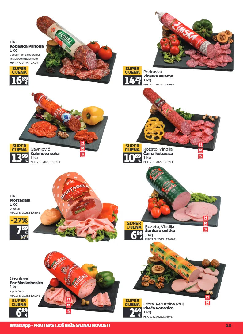 whatsapp - prati nas i još brže saznaj novosti 13 pik kobasica panona 1 kg s cijelim zrncima papra ili s blagom paprikom mpc 2. 5. 2025.: 22,49 € 16 89 super cijena gavrilović kulenova seka 1 kg mpc 2. 5. 2025.: 19,99 € 13 99 super cijena rozeto, vindija čajna kobasica 1 kg mpc 2. 5. 2025.: 16,99 € 10 89 super cijena 7 89 10 89 -27% pik mortadela 1 kg original mpc 2. 5. 2025.: 10,89 € rozeto, vindija šunka u ovitku 1 kg mpc 2. 5. 2025.: 13,49 € 6 89 super cijena podravka zimska salama 1 kg mpc 2. 5. 2025.: 20,99 € 14 29 super cijena gavrilović pariška kobasica 1 kg s povrćem mpc 2. 5. 2025.: 10,99 € 6 89 super cijena extra, perutnina ptuj pileća kobasica 1 kg mpc 2. 5. 2025.: 3,69 € 2 49 super cijena