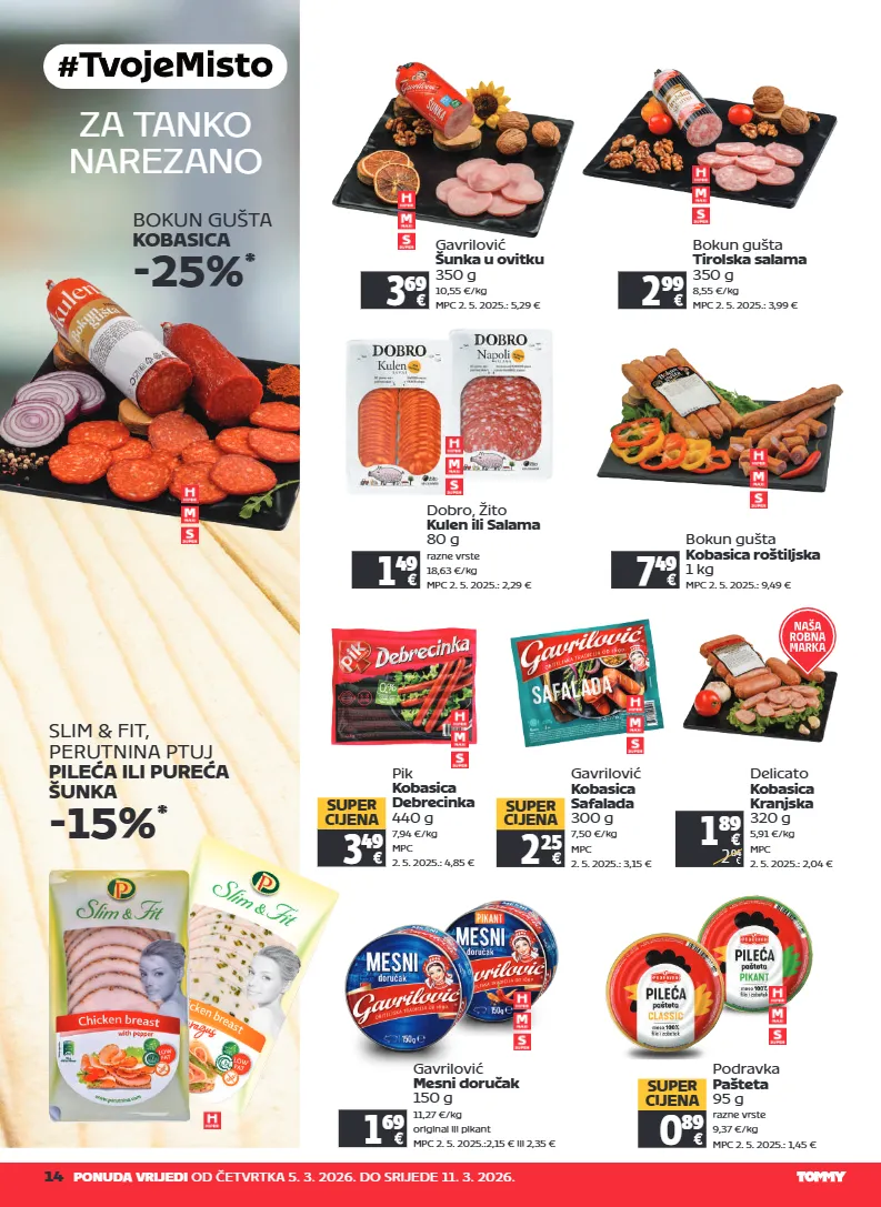 14 ponuda vrijedi od četvrtka 5. 3. 2026. do srijede 11. 3. 2026. bokun gušta kobasica -25% * dobro, žito kulen ili salama 80 g razne vrste 18,63 €/kg mpc 2. 5. 2025.: 2,29 € 1 49 gavrilović šunka u ovitku 350 g 10,55 €/kg mpc 2. 5. 2025.: 5,29 € 3 69 bokun gušta tirolska salama 350 g 8,55 €/kg mpc 2. 5. 2025.: 3,99 € 2 99 bokun gušta kobasica roštiljska 1 kg mpc 2. 5. 2025.: 9,49 € 7 49 pik kobasica debrecinka 440 g 7,94 €/kg mpc 2. 5. 2025.: 4,85 € 3 49 super cijena gavrilović kobasica safalada 300 g 7,50 €/kg mpc 2. 5. 2025.: 3,15 € 2 25 super cijena 1 89 2 04 delicato kobasica kranjska 320 g 5,91 €/kg mpc 2. 5. 2025.: 2,04 € podravka pašteta 95 g razne vrste 9,37 €/kg mpc 2. 5. 2025.: 1,45 € 0 89 super cijena slim & fit, perutnina ptuj pileća ili pureća šunka -15% * gavrilović mesni doručak 150 g 11,27 €/kg original ili pikant mpc 2. 5. 2025.:2,15 € ili 2,35 € 1 69 za tanko narezano