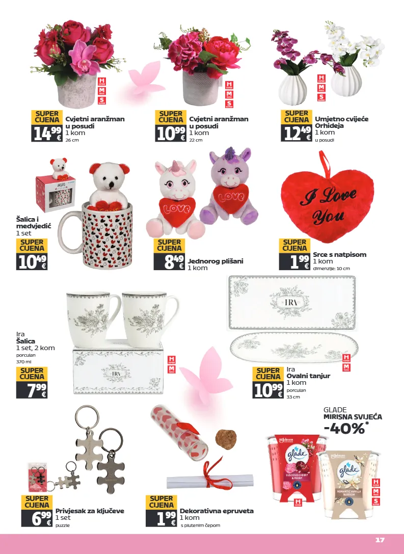17 jednorog plišani 1 kom 8 49 super cijena cvjetni aranžman u posudi 1 kom 22 cm 10 99 super cijena umjetno cvijeće orhideja 1 kom u posudi 12 49 super cijena šalica i medvjedić 1 set 10 49 super cijena privjesak za ključeve 1 set puzzle 6 99 super cijena srce s natpisom 1 kom dimenzije: 10 cm 1 99 super cijena dekorativna epruveta 1 kom s plutenim čepom 1 99 super cijena glade mirisna svijeća -40% * ira šalica 1 set, 2 kom porculan 370 ml 7 99 super cijena ira ovalni tanjur 1 kom porculan 33 cm 10 99 super cijena cvjetni aranžman u posudi 1 kom 26 cm 14 99 super cijena