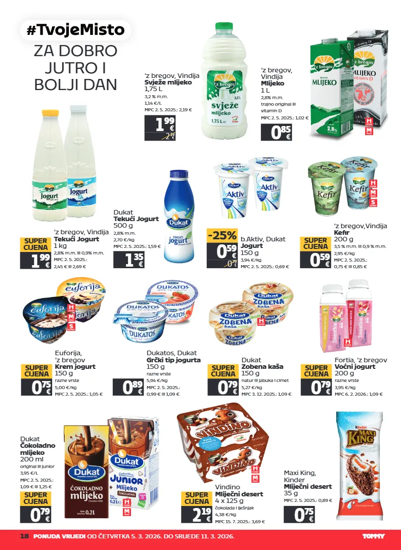 18 ponuda vrijedi od četvrtka 5. 3. 2026. do srijede 11. 3. 2026. 0 85 ‘z bregov, vindija mlijeko 1 l 2,8% m.m. trajno original ili vitamin d mpc 2. 5. 2025.: 1,02 € za dobro jutro i bolji dan dukat tekući jogurt 500 g 2,8% m.m. 2,70 €/kg mpc 2. 5. 2025.: 1,59 € 1 35 euforija, ‘z bregov krem jogurt 150 g razne vrste 5,00 €/kg mpc 2. 5. 2025.: 1,05 € 0 75 super cijena dukatos, dukat grčki tip jogurta 150 g razne vrste 5,94 €/kg mpc 2. 5. 2025.: 0,99 € ili 1,09 € 0 89 dukat zobena kaša 150 g natur ili jabuka i cimet 5,27 €/kg mpc 3. 12. 2025.: 1,09 € 0 79 super cijena vindino mliječni desert 4 x 125 g čokolada i lješnjak 4,38 €/kg mpc 15. 7. 2025.: 3,69 € 2 19 super cijena 0 79 super cijena fortia, ‘z bregov voćni jogurt 200 g razne vrste 3,95 €/kg mpc 6. 2. 2026.: 1,09 € 1 99 2 19 ‘z bregov, vindija svježe mlijeko 1,75 l 3,2 % m.m. 1,14 €/l mpc 2. 5. 2025.: 2,19 € ‘z bregov, vindija tekući jogurt 1 kg 2,8% m.m. ili 0,9% m.m. mpc 2. 5. 2025.: 2,45 € ili 2,69 € 1 99 super cijena 0 59 0 79 -25% b.aktiv, dukat jogurt 150 g 3,94 €/kg mpc 2. 5. 2025.: 0,69 € 0 59 super cijena ‘z bregov,vindija kefir 200 g 3,5 % m.m. ili 0,9 % m.m. 2,95 €/kg mpc 2. 5. 2025.: 0,75 € ili 0,85 € dukat čokoladno mlijeko 200 ml original ili junior 3,95 €/l mpc 2. 5. 2025.: 1,09 € ili 1,25 € 0 79 super cijena maxi king, kinder mliječni desert 35 g mpc 2. 5. 2025.: 0,89 € 0 75