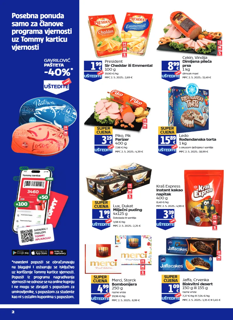 posebna ponuda samo za članove programa vjernosti uz tommy karticu vjernosti *navedeni popusti se obračunavaju na blagajni i ostvaruju se isključivo uz korištenje tommy kartice vjernosti. popusti iz programa nagrađivanja vjernosti ne odnose se na online kupnju i ne mogu se zbrajati s popustom za umirovljenike, s popustom za studente kao ni s ostalim kuponima s popustom. +50 +100 +100 +50 +100 +100 2 kraš express instant kakao napitak 400 g 8,48 €/kg mpc 2. 5. 2025.: 4,99 € uštedite 3 39 merci, storck bombonijera 250 g razne vrste 19,96 €/kg mpc 2. 5. 2025.: 8,99 € uštedite super cijena 4 99 jaffa, crvenka biskvitni desert 150 g ili 155 g razne vrste 7,27 €/kg ili 7,04 €/kg mpc 2. 5. 2025.: 1,35 € ili 1,45 € uštedite super cijena 1 09 uštedite gavrilović pašteta -40% * s m r z n u t o s m r z n u t o lux, dukat mliječni puding 4x125 g čokolada ili vanilija 3,98 €/kg mpc 2. 5. 2025.: 2,25 € uštedite super cijena 1 99 piko, pik parizer 400 g 7,98 €/kg mpc 2. 5. 2025.: 4,39 € president sir cheddar ili emmental 100 g 19,90 €/kg mpc 2. 5. 2025.: 2,69 € ledo rođendanska torta 1 kg s okusom lješnjaka i vanilije mpc 2. 5. 2025.: 18,99 € cekin, vindija dimljena pileća prsa 1 kg dimcek maxi mpc 2. 5. 2025.: 11,49 € uštedite super cijena 3 19 uštedite 1 99 uštedite super cijena 15 89 uštedite 8 99
