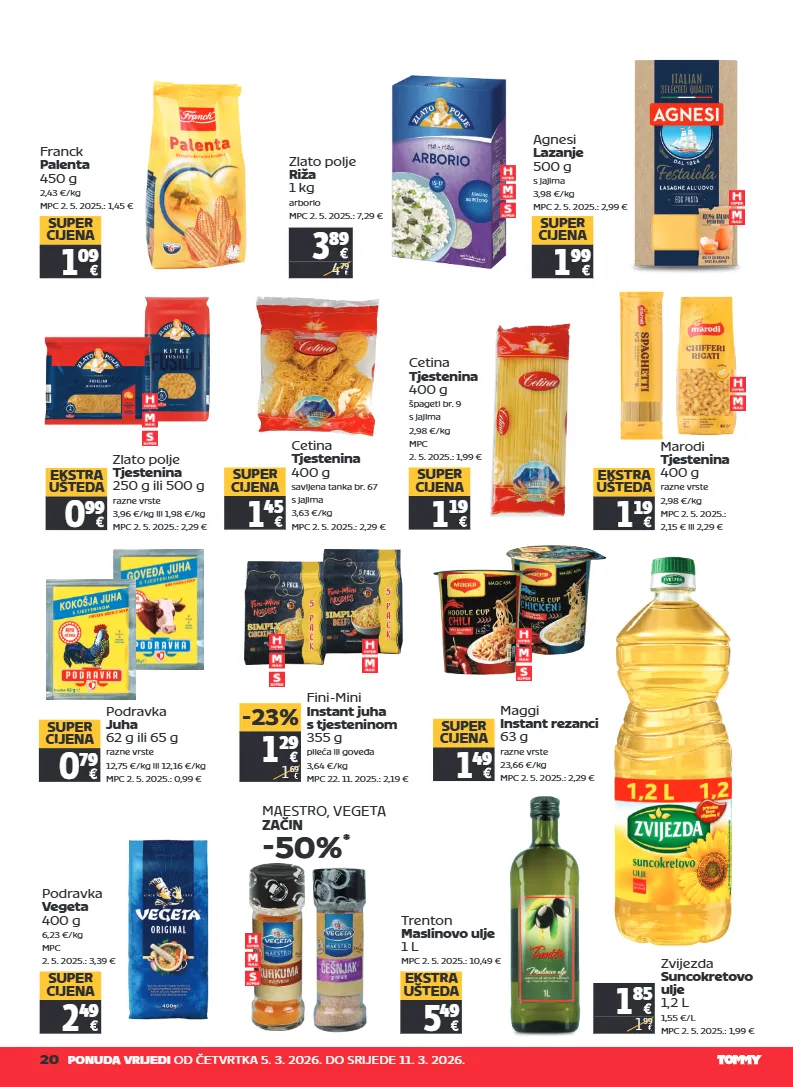 20 ponuda vrijedi od četvrtka 5. 3. 2026. do srijede 11. 3. 2026. 1 85 1 99 franck palenta 450 g 2,43 €/kg mpc 2. 5. 2025.: 1,45 € 1 09 super cijena zlato polje riža 1 kg arborio mpc 2. 5. 2025.: 7,29 € agnesi lazanje 500 g s jajima 3,98 €/kg mpc 2. 5. 2025.: 2,99 € 1 99 super cijena zlato polje tjestenina 250 g ili 500 g razne vrste 3,96 €/kg ili 1,98 €/kg mpc 2. 5. 2025.: 2,29 € 0 99 ekstra ušteda cetina tjestenina 400 g savijena tanka br. 67 s jajima 3,63 €/kg mpc 2. 5. 2025.: 2,29 € 1 45 super cijena cetina tjestenina 400 g špageti br. 9 s jajima 2,98 €/kg mpc 2. 5. 2025.: 1,99 € 1 19 super cijena marodi tjestenina 400 g razne vrste 2,98 €/kg mpc 2. 5. 2025.: 2,15 € ili 2,29 € 1 19 ekstra ušteda podravka vegeta 400 g 6,23 €/kg mpc 2. 5. 2025.: 3,39 € 2 49 super cijena maestro, vegeta začin -50% * podravka juha 62 g ili 65 g razne vrste 12,75 €/kg ili 12,16 €/kg mpc 2. 5. 2025.: 0,99 € 0 79 super cijena maggi instant rezanci 63 g razne vrste 23,66 €/kg mpc 2. 5. 2025.: 2,29 € 1 49 super cijena trenton maslinovo ulje 1 l mpc 2. 5. 2025.: 10,49 € 5 49 ekstra ušteda zvijezda suncokretovo ulje 1,2 l 1,55 €/l mpc 2. 5. 2025.: 1,99 € 1 29 1 69 -23% fini-mini instant juha s tjesteninom 355 g pileća ili goveđa 3,64 €/kg mpc 22. 11. 2025.: 2,19 € 3 89 4 79