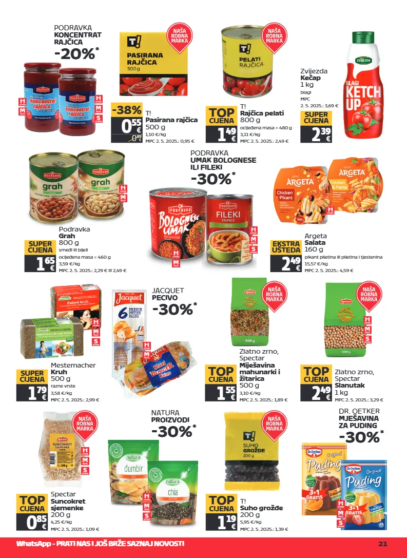 whatsapp - prati nas i još brže saznaj novosti 21 0 55 0 89 -38% podravka koncentrat rajčica -20% * t! pasirana rajčica 500 g 1,10 €/kg mpc 2. 5. 2025.: 0,95 € t! rajčica pelati 800 g ocijeđena masa = 480 g 3,11 €/kg mpc 2. 5. 2025.: 2,49 € 1 49 top cijena zvijezda kečap 1 kg blagi mpc 2. 5. 2025.: 3,69 € 2 39 super cijena podravka grah 800 g smeđi ili bijeli ocijeđena masa = 460 g 3,59 €/kg mpc 2. 5. 2025.: 2,29 € ili 2,49 € 1 65 super cijena podravka umak bolognese ili fileki -30% * argeta salata 160 g pikant piletina ili piletina i tjestenina 15,57 €/kg mpc 2. 5. 2025.: 4,59 € 2 49 ekstra ušteda mestemacher kruh 500 g razne vrste 3,58 €/kg mpc 2. 5. 2025.: 2,99 € 1 79 super cijena jacquet pecivo -30% * zlatno zrno, spectar miješavina mahunarki i žitarica 500 g 3,10 €/kg mpc 2. 5. 2025.: 1,89 € 1 55 top cijena zlatno zrno, spectar slanutak 1 kg mpc 2. 5. 2025.: 3,29 € 2 49 top cijena spectar suncokret sjemenke 200 g 4,25 €/kg mpc 2. 5. 2025.: 1,09 € 0 85 top cijena natura proizvodi -30% * t! suho grožđe 200 g 5,95 €/kg mpc 2. 5. 2025.: 1,39 € 1 19 top cijena dr. oetker mješavina za puding -30% *