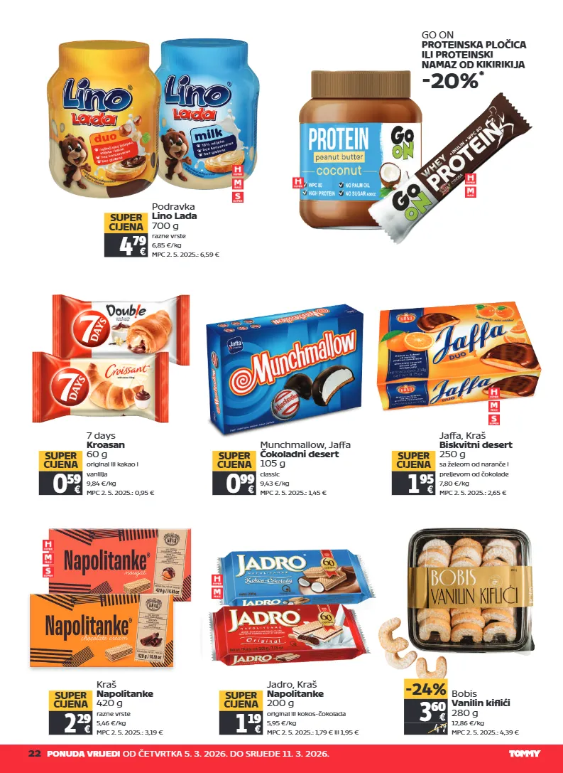 22 ponuda vrijedi od četvrtka 5. 3. 2026. do srijede 11. 3. 2026. go on proteinska pločica ili proteinski namaz od kikirikija -20% * 7 days kroasan 60 g original ili kakao i vanilija 9,84 €/kg mpc 2. 5. 2025.: 0,95 € 0 59 super cijena munchmallow, jaffa čokoladni desert 105 g classic 9,43 €/kg mpc 2. 5. 2025.: 1,45 € 0 99 super cijena jaffa, kraš biskvitni desert 250 g sa želeom od naranče i preljevom od čokolade 7,80 €/kg mpc 2. 5. 2025.: 2,65 € 1 95 super cijena kraš napolitanke 420 g razne vrste 5,46 €/kg mpc 2. 5. 2025.: 3,19 € 2 29 super cijena jadro, kraš napolitanke 200 g original ili kokos-čokolada 5,95 €/kg mpc 2. 5. 2025.: 1,79 € ili 1,95 € 1 19 super cijena 3 60 4 79 -24% bobis vanilin kiflići 280 g 12,86 €/kg mpc 2. 5. 2025.: 4,39 € podravka lino lada 700 g razne vrste 6,85 €/kg mpc 2. 5. 2025.: 6,59 € 4 79 super cijena