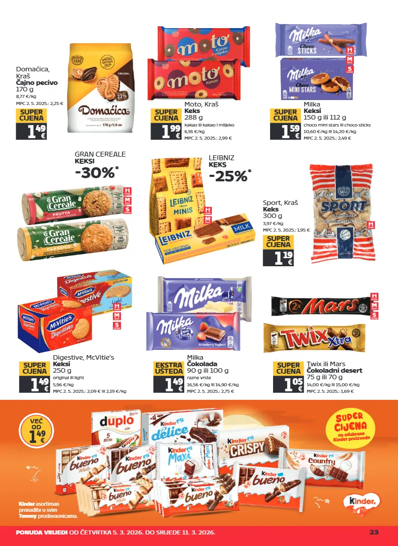 s u p er c i jen a na odabrane kinder proizvode kinder asortiman pronađite u svim tommy prodavaonicama. moto, kraš keks 288 g kakao ili kakao i mlijeko 6,91 €/kg mpc 2. 5. 2025.: 2,99 € 1 99 super cijena milka keksi 150 g ili 112 g choco mini stars ili choco sticks 10,60 €/kg ili 14,20 €/kg mpc 2. 5. 2025.: 2,49 € 1 59 super cijena domaćica, kraš čajno pecivo 170 g 8,77 €/kg mpc 2. 5. 2025.: 2,25 € 1 49 super cijena gran cereale keksi -30% * leibniz keks -25% * sport, kraš keks 300 g 3,97 €/kg mpc 2. 5. 2025.: 1,95 € 1 19 super cijena digestive, mcvitie’s keksi 250 g original ili light 5,96 €/kg mpc 2. 5. 2025.: 2,09 € ili 2,19 €/kg 1 49 super cijena milka čokolada 90 g ili 100 g razne vrste 16,56 €/kg ili 14,90 €/kg mpc 2. 5. 2025.: 2,75 € 1 49 ekstra ušteda twix ili mars čokoladni desert 75 g ili 70 g 14,00 €/kg ili 15,00 €/kg mpc 2. 5. 2025.: 1,69 € 1 05 super cijena ponuda vrijedi od četvrtka 5. 3. 2026. do srijede 11. 3. 2026. 23