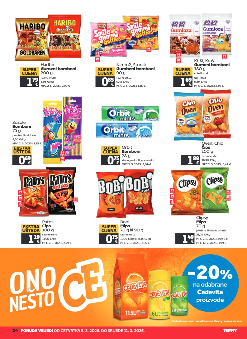 cedevita asortiman pronađite u svim tommy prodavaonicama -20 % na odabrane cedevita proizvode haribo gumeni bomboni 200 g razne vrste 8,95 €/kg mpc 2. 5. 2025.: 2,99 € 1 79 super cijena nimm2, storck gumbeni bomboni 90 g razne vrste 9,45 €/kg mpc 2. 5. 2025.: 1,35 € 0 85 super cijena ki-ki, kraš gumeni bomboni 180 g cola ili crvi gumioza 9,39 €/kg mpc 2. 5. 2025.: 2,69 € 1 69 super cijena zozole bomboni 75 g painter ili rainbow 9,20 €/kg mpc 2. 5. 2025.: 1,25 € 0 69 ekstra ušteda orbit bomboni 28 g strong mint ili spearmint mpc 2. 5. 2025.: 1,09 € 0 75 super cijena oven, chio čips 100 g razne vrste 18,90 €/kg mpc 2. 5. 2025.: 2,49 € 1 89 patos čips 100 g razne vrste 11,90 €/kg mpc 2. 5. 2025.: 2,29 € 1 19 ekstra ušteda bobi flips 70 g ili 90 g razne vrste 10,72 €/kg ili 8,34 €/kg mpc 2. 5. 2025.: 1,05 € 0 75 super cijena clipsy flips 70 g piletina ili kiselo vrhnje 21,29 €/kg mpc 2. 5. 2025.: 1,99 € ili mpc 17. 7. 2025.: 1,99 € 1 49 24 ponuda vrijedi od četvrtka 5. 3. 2026. do srijede 11. 3. 2026.