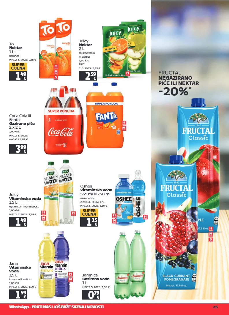 fructal negazirano piće ili nektar -20% * to nektar 1 l naranča mpc 2. 5. 2025.: 2,15 € 1 49 super cijena coca cola ili fanta gazirano piće 2 x 2 l 1,00 €/l mpc 2. 5. 2025.: 4,45 € ili 4,89 € 3 99 juicy vitaminska voda 1,5 l optimist ili imuno boost 1,00 €/l mpc 2. 5. 2025.: 1,89 € 1 49 oshee vitaminska voda 555 ml ili 750 ml razne vrste 2,28 €/l ili 1,67 €/l mpc 2. 5. 2025.: 1,69 € 1 25 super cijena juicy nektar 2 l multivitamin ili jabuka 1,30 €/l mpc 2. 5. 2025.: 3,85 € 2 59 jana vitaminska voda 1,5 l immuno ili antiox 1,06 €/l mpc 2. 5. 2025.: 1,99 € 1 59 jamnica gazirana voda 1 l mpc 2. 5. 2025.: 1,05 € 0 79 whatsapp - prati nas i još brže saznaj novosti 25