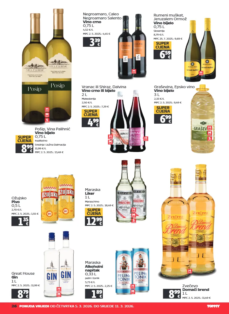 26 ponuda vrijedi od četvrtka 5. 3. 2026. do srijede 11. 3. 2026. graševina, epsko vino vino bijelo 3 l 2,33 €/l mpc 2. 5. 2025.: 9,49 € 6 99 super cijena pošip, vina palihnić vino bijelo 0,75 l kvalitetno srednja i južna dalmacija 11,99 €/l mpc 2. 5. 2025.: 13,49 € negroamaro, caleo negroamaro salento vino crno 0,75 l 4,52 €/l mpc 2. 5. 2025.: 4,45 € 3 39 8 99 super cijena rumeni muškat, jeruzalem ormož vino bijelo 0,75 l slovenija 8,79 €/l mpc 25. 7. 2025.: 9,69 € 6 59 super cijena vranac ili shiraz, dalvina vino crno ili bijelo 2 l makedonija 2,50 €/l mpc 2. 5. 2025.: 7,29 € 4 99 super cijena ožujsko pivo 0,5 l 2,70 €/l mpc 2. 5. 2025.: 1,55 € 1 35 maraska liker 1 l maraschino mpc 2. 5. 2025.: 18,49 € 12 99 super cijena zvečevo domaći brend 1 l mpc 2. 5. 2025.: 11,49 € 8 99 great house gin 1 l mpc 2. 5. 2025.: 11,99 € 8 79 maraska alkoholni napitak 0,33 l pelin i tonik 5,73 €/l mpc 2. 5. 2025.: 2,25 € 1 89