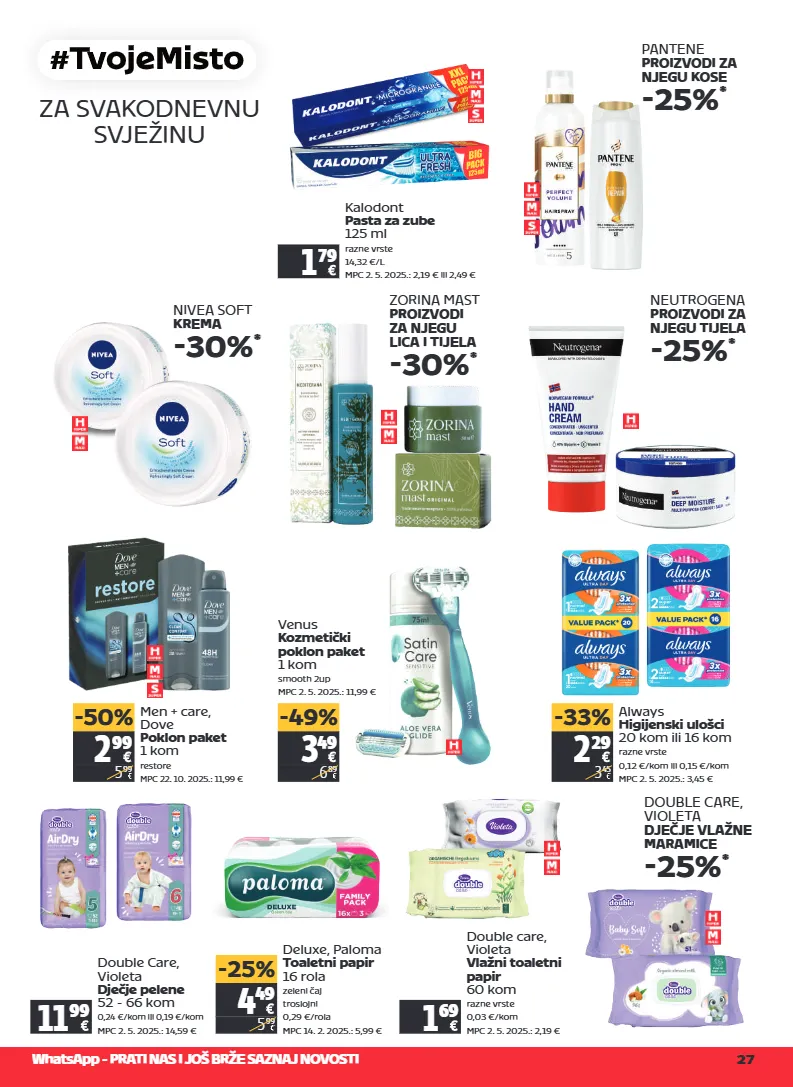 whatsapp - prati nas i još brže saznaj novosti 27 za svakodnevnu svježinu 1 79 kalodont pasta za zube 125 ml razne vrste 14,32 €/l mpc 2. 5. 2025.: 2,19 € ili 2,49 € pantene proizvodi za njegu kose -25% * nivea soft krema -30% * zorina mast proizvodi za njegu lica i tijela -30% * neutrogena proizvodi za njegu tijela -25% * 3 49 6 89 -49% venus kozmetički poklon paket 1 kom smooth 2up mpc 2. 5. 2025.: 11,99 € men + care, dove poklon paket 1 kom restore mpc 22. 10. 2025.: 11,99 € 2 99 5 99 -50% 2 29 3 45 -33% always higijenski ulošci 20 kom ili 16 kom razne vrste 0,12 €/kom ili 0,15 €/kom mpc 2. 5. 2025.: 3,45 € 11 99 double care, violeta dječje pelene 52 - 66 kom 0,24 €/kom ili 0,19 €/kom mpc 2. 5. 2025.: 14,59 € 4 49 5 99 -25% deluxe, paloma toaletni papir 16 rola zeleni čaj troslojni 0,29 €/rola mpc 14. 2. 2025.: 5,99 € double care, violeta vlažni toaletni papir 60 kom razne vrste 0,03 €/kom mpc 2. 5. 2025.: 2,19 € 1 69 double care, violeta dječje vlažne maramice -25% *