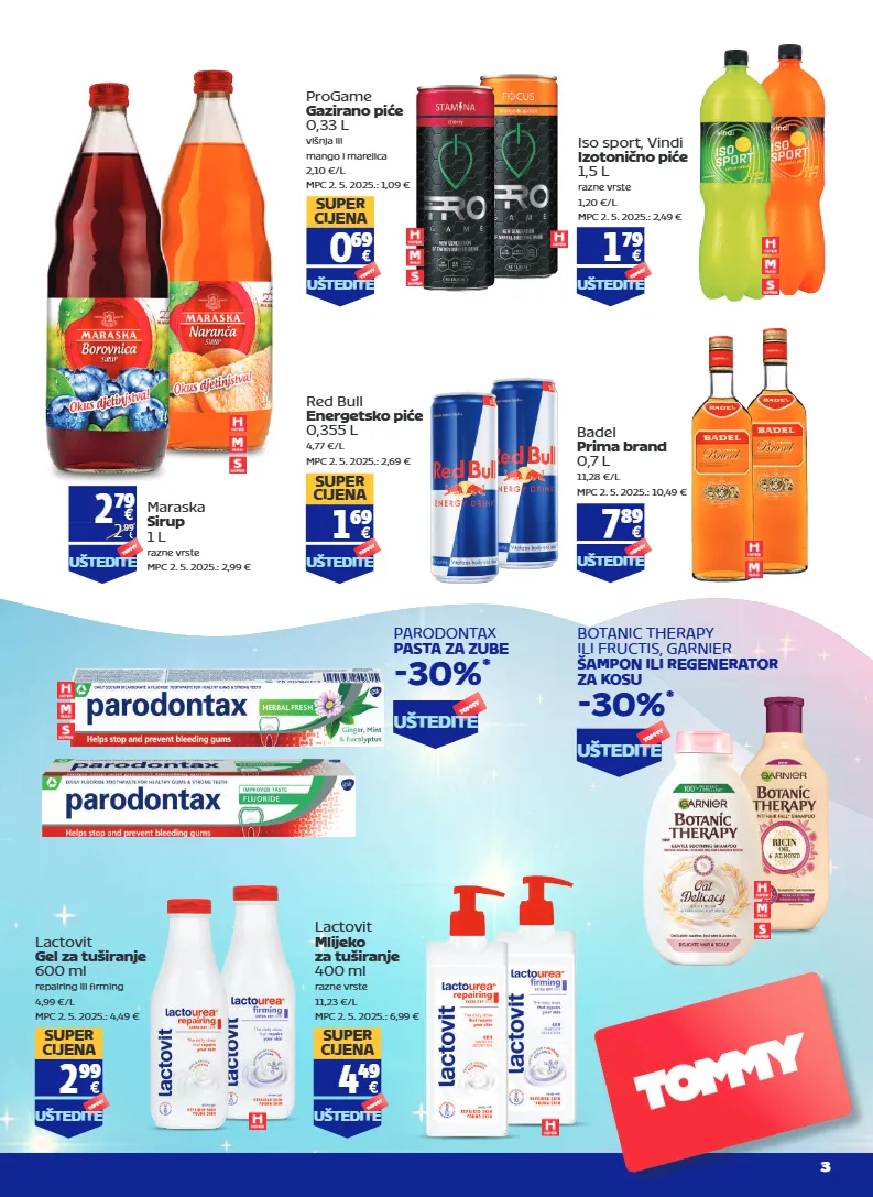 3 progame gazirano piće 0,33 l višnja ili mango i marelica 2,10 €/l mpc 2. 5. 2025.: 1,09 € uštedite super cijena 0 69 iso sport, vindi izotonično piće 1,5 l razne vrste 1,20 €/l mpc 2. 5. 2025.: 2,49 € uštedite 1 79 red bull energetsko piće 0,355 l 4,77 €/l mpc 2. 5. 2025.: 2,69 € uštedite super cijena 1 69 badel prima brand 0,7 l 11,28 €/l mpc 2. 5. 2025.: 10,49 € uštedite 7 89 lactovit gel za tuširanje 600 ml repairing ili firming 4,99 €/l mpc 2. 5. 2025.: 4,49 € uštedite super cijena 2 99 lactovit mlijeko za tuširanje 400 ml razne vrste 11,23 €/l mpc 2. 5. 2025.: 6,99 € uštedite super cijena 4 49 2 99 uštedite 2 79 maraska sirup 1 l razne vrste mpc 2. 5. 2025.: 2,99 € parodontax pasta za zube -30% * uštedite botanic therapy ili fructis, garnier šampon ili regenerator za kosu -30% * uštedite
