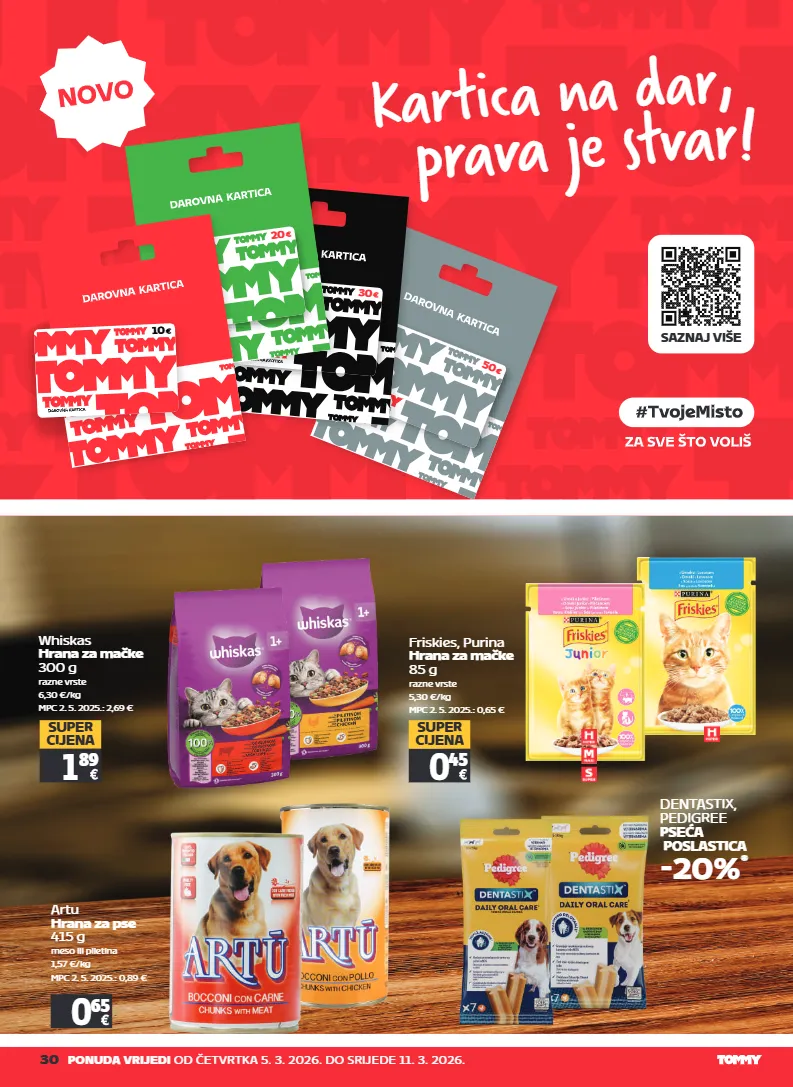 30 ponuda vrijedi od četvrtka 5. 3. 2026. do srijede 11. 3. 2026. whiskas hrana za mačke 300 g razne vrste 6,30 €/kg mpc 2. 5. 2025.: 2,69 € 1 89 super cijena friskies, purina hrana za mačke 85 g razne vrste 5,30 €/kg mpc 2. 5. 2025.: 0,65 € 0 45 super cijena dentastix, pedigree pseća poslastica -20% * kartica na dar, prava je stvar! 50 € 30 € 20 € 10 € saznaj više artu hrana za pse 415 g meso ili piletina 1,57 €/kg mpc 2. 5. 2025.: 0,89 € 0 65