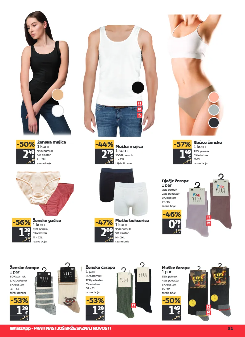 whatsapp - prati nas i još brže saznaj novosti 31 ženske čarape 1 par 80% pamuk 17% poliester 3% elastan 38 - 41 razni dezeni 1 29 2 79 -53% dječje čarape 1 par 75% pamuk 22% poliester 3% elastan 25-36 razne boje 0 79 1 49 -46% ženske čarape 1 par 80% pamuk 17% poliester 3% elastan 38 - 41 razne boje 1 29 2 79 -53% ženske gaćice 1 kom 95% pamuk 5% elastan m - 2xl razne boje 1 29 2 99 -56% muške bokserice 1 kom 95% pamuk 5% elastan m - 2xl razne boje 2 09 3 99 -47% muška majica 1 kom 100% pamuk l - 2xl bijela ili crna 2 79 4 99 -44% 1 49 3 49 -57% gaćice ženske 1 kom 95% pamuk 5% elastan m-xl razne boje 2 49 4 99 -50% ženska majica 1 kom 95% pamuk 5% elastan l - 2xl razne boje muške čarape 1 par 55% pamuk 42% poliester 3% elastan 39-49 razne boje 1 49 2 99 -50%