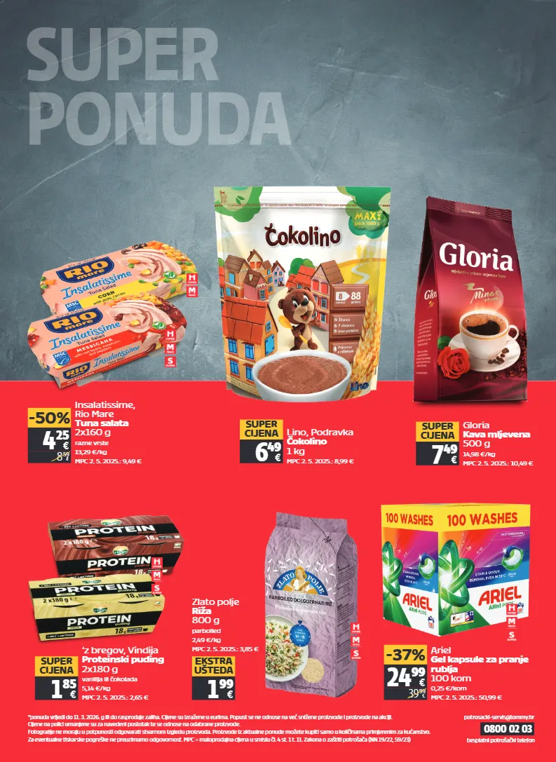 32 ponuda vrijedi od četvrtka 5. 3. 2026. do srijede 11. 3. 2026. 0800 02 03 *ponuda vrijedi do 11. 3. 2026. g ili do rasprodaje zaliha. cijene su izražene u eurima. popust se ne odnose na već snižene proizvode i proizvode na akciji. cijene na polici umanjene su za navedeni postotak te se odnose na odabrane proizvode. fotografije ne moraju u potpunosti odgovarati stvarnom izgledu proizvoda. proizvode iz aktualne ponude možete kupiti samo u količinama primjerenim za kućanstvo. za eventualne tiskarske pogreške ne preuzimamo odgovornost. mpc = maloprodajna cijena u smislu čl. 4 st. 1 t. 11. zakona o zaštiti potrošača (nn 19/22, 59/23) besplatni potrošački telefon potrosacki-servis@tommy.hr super ponuda ‘z bregov, vindija proteinski puding 2x180 g vanilija ili čokolada 5,14 €/kg mpc 2. 5. 2025.: 2,65 € 1 85 super cijena 4 25 8 59 -50% insalatissime, rio mare tuna salata 2x160 g razne vrste 13,29 €/kg mpc 2. 5. 2025.: 9,49 € lino, podravka čokolino 1 kg mpc 2. 5. 2025.: 8,99 € 6 49 super cijena gloria kava mljevena 500 g 14,98 €/kg mpc 2. 5. 2025.: 10,49 € 7 49 super cijena zlato polje riža 800 g parboiled 2,49 €/kg mpc 2. 5. 2025.: 3,85 € 1 99 ekstra ušteda 24 99 39 99 -37% ariel gel kapsule za pranje rublja 100 kom 0,25 €/kom mpc 2. 5. 2025.: 50,99 €