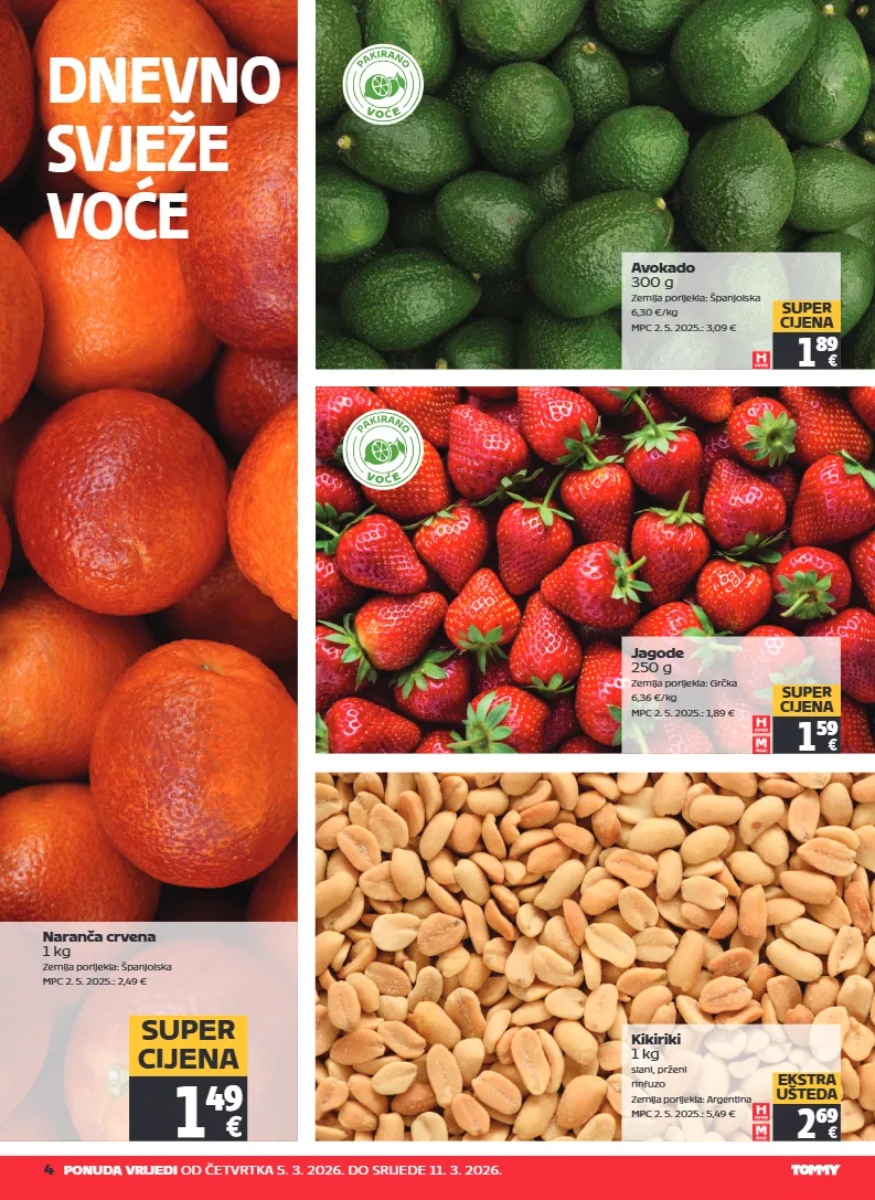 4 ponuda vrijedi od četvrtka 5. 3. 2026. do srijede 11. 3. 2026. dnevno svježe voće naranča crvena 1 kg zemlja porijekla: španjolska mpc 2. 5. 2025.: 2,49 € 1 49 super cijena avokado 300 g zemlja porijekla: španjolska 6,30 €/kg mpc 2. 5. 2025.: 3,09 € 1 89 super cijena jagode 250 g zemlja porijekla: grčka 6,36 €/kg mpc 2. 5. 2025.: 1,89 € 1 59 super cijena kikiriki 1 kg slani, prženi rinfuzo zemlja porijekla: argentina mpc 2. 5. 2025.: 5,49 € 2 69 ekstra ušteda v o e v o e