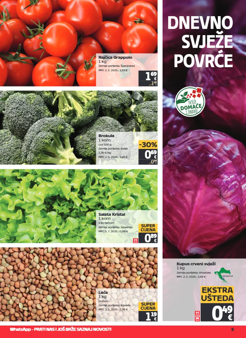 whatsapp - prati nas i još brže saznaj novosti 5 dnevno svježe povrće 0 49 ekstra ušteda kupus crveni svježi 1 kg zemlja porijekla: hrvatska mpc 2. 5. 2025.: 1,69 € rajčica grappolo 1 kg zemlja porijekla: španjolska mpc 2. 5. 2025.: 2,19 € 1 69 1 95 salata kristal 1 kom s korijenom zemlja porijekla: slovenija mpc 5. 7. 2025.: 0,99 € 0 89 super cijena brokula 1 kom cca 500 g zemlja porijekla: italija 1,38 €/kg mpc 2. 5. 2025.: 1,49 € 0 69 0 99 -30% leća 1 kg rinfuzo zemlja porijekla: kanada mpc 2. 5. 2025.: 2,39 € 1 19 super cijena