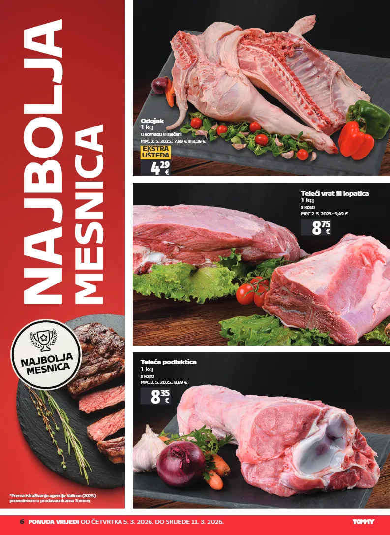 *prema istraživanju agencije valicon (2025.) provedenom u prodavaonicama tommy. 6 ponuda vrijedi od četvrtka 5. 3. 2026. do srijede 11. 3. 2026. odojak 1 kg u komadu ili sječeni mpc 2. 5. 2025.: 7,99 € ili 8,39 € 4 29 ekstra ušteda teleći vrat ili lopatica 1 kg s kosti mpc 2. 5. 2025.: 9,49 € 8 75 teleća podlaktica 1 kg s kosti mpc 2. 5. 2025.: 8,89 € 8 35