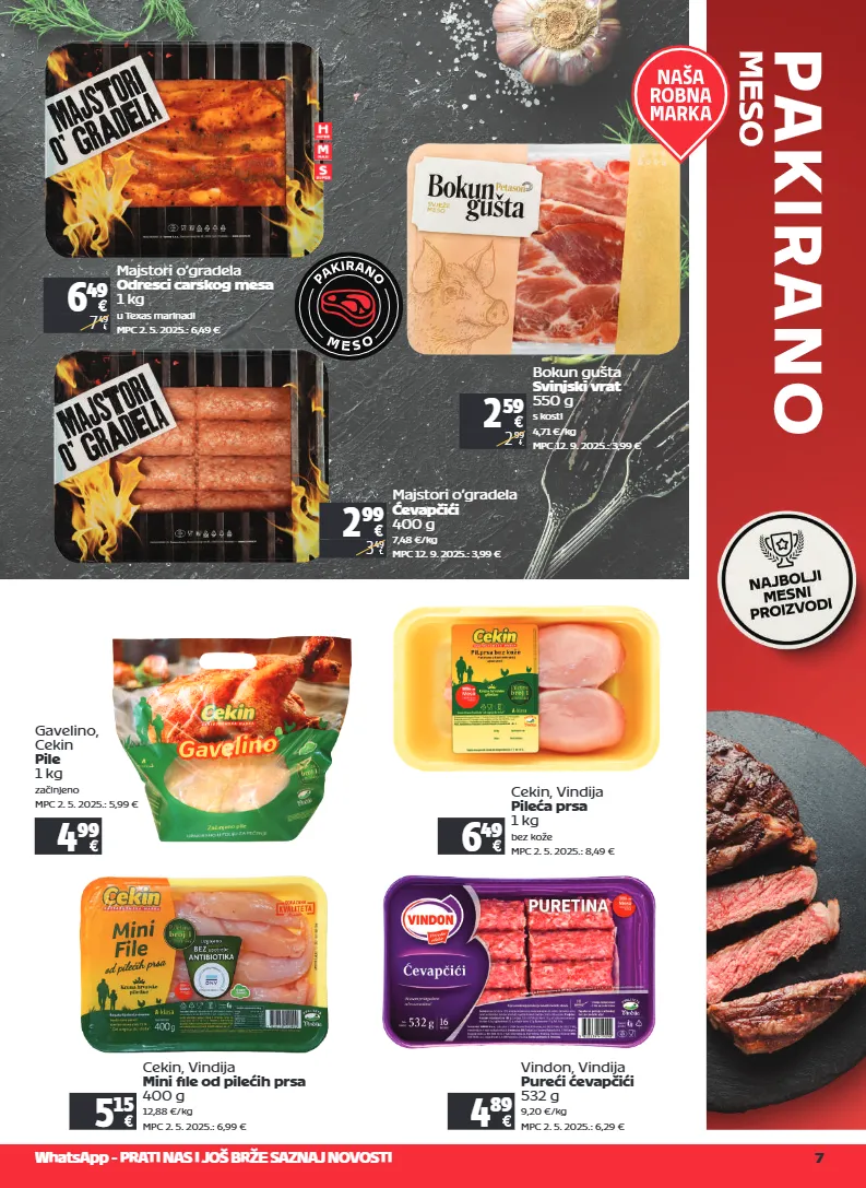 whatsapp - prati nas i još brže saznaj novosti 7 2 59 2 99 6 49 7 49 majstori o’gradela odresci carskog mesa 1 kg u texas marinadi mpc 2. 5. 2025.: 6,49 € bokun gušta svinjski vrat 550 g s kosti 4,71 €/kg mpc 12. 9. 2025.: 3,99 € gavelino, cekin pile 1 kg začinjeno mpc 2. 5. 2025.: 5,99 € 4 99 cekin, vindija pileća prsa 1 kg bez kože mpc 2. 5. 2025.: 8,49 € 6 49 cekin, vindija mini file od pilećih prsa 400 g 12,88 €/kg mpc 2. 5. 2025.: 6,99 € 5 15 vindon, vindija pureći ćevapčići 532 g 9,20 €/kg mpc 2. 5. 2025.: 6,29 € 4 89 2 99 3 49 majstori o’gradela ćevapčići 400 g 7,48 €/kg mpc 12. 9. 2025.: 3,99 €