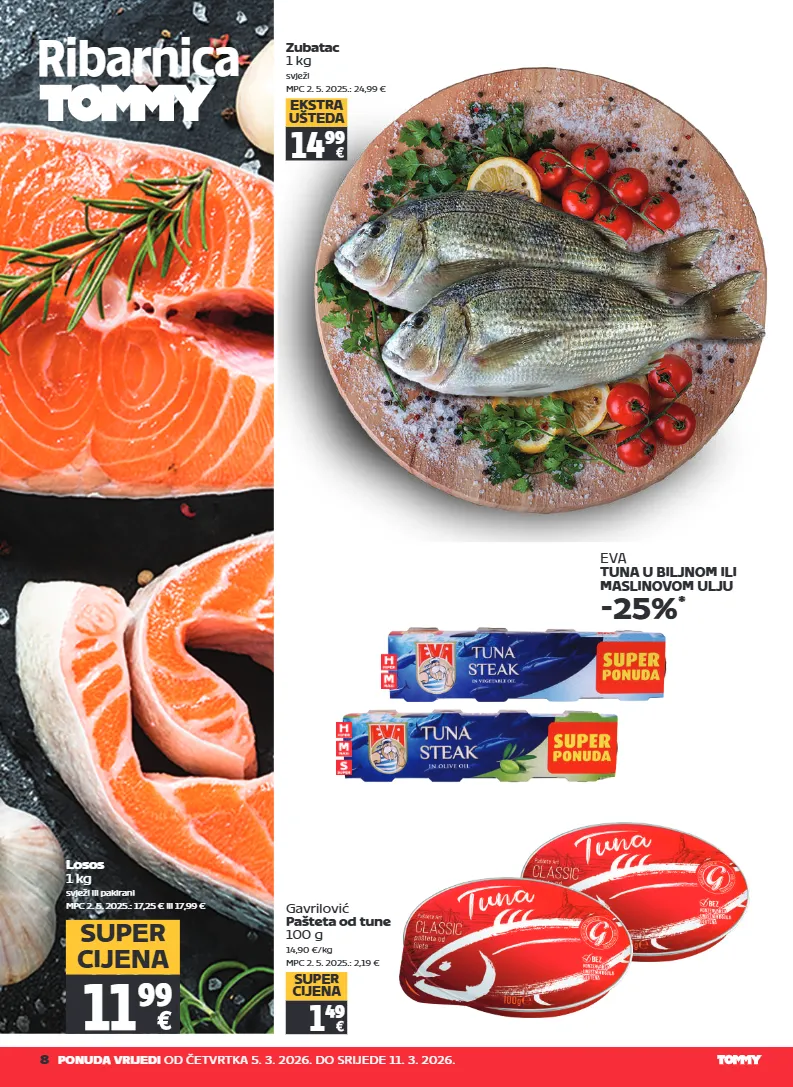 8 ponuda vrijedi od četvrtka 5. 3. 2026. do srijede 11. 3. 2026. ribarnica eva tuna u biljnom ili maslinovom ulju -25% * gavrilović pašteta od tune 100 g 14,90 €/kg mpc 2. 5. 2025.: 2,19 € 1 49 super cijena losos 1 kg svježi ili pakirani mpc 2. 5. 2025.: 17,25 € ili 17,99 € 11 99 super cijena zubatac 1 kg svježi mpc 2. 5. 2025.: 24,99 € 14 99 ekstra ušteda