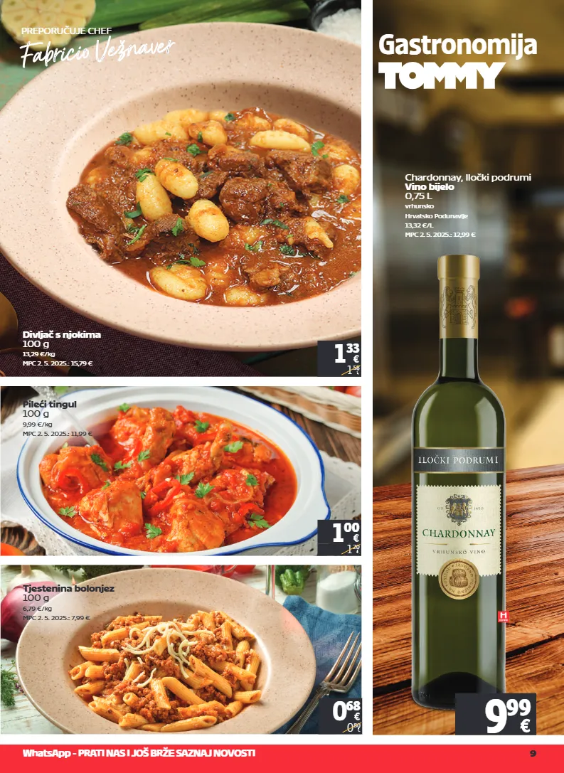 whatsapp - prati nas i još brže saznaj novosti 9 gastronomija chardonnay, iločki podrumi vino bijelo 0,75 l vrhunsko hrvatsko podunavlje 13,32 €/l mpc 2. 5. 2025.: 12,99 € divljač s njokima 100 g 13,29 €/kg mpc 2. 5. 2025.: 15,79 € preporučuje chef 1 33 1 58 pileći tingul 100 g 9,99 €/kg mpc 2. 5. 2025.: 11,99 € 0 68 0 80 tjestenina bolonjez 100 g 6,79 €/kg mpc 2. 5. 2025.: 7,99 € 1 00 1 20 9 99