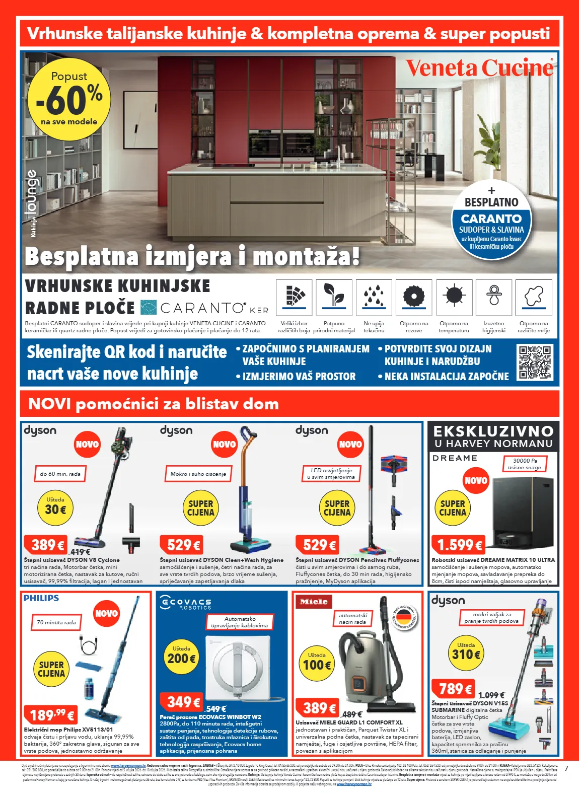 7 opći uvjeti i načini plaćanja su na raspolaganju u trgovini i na web stranici www.harveynorman.hr . redovno radno vrijeme naših trgovina: zagreb – v.škorpika 34/2, 10 000 zagreb (tc king cross), tel: 01/55 66 200, od ponedjeljka do subote od 09.00h do 21.00h; pula – ulica rimske centurijacije 102, 52 100 pula, tel: 052/ 554 520, od ponedjeljka do subote od 9.00h do 21.00h i rijeka – kukuljanovo 362, 51227 kukuljanovo, tel: 051/309 888, od ponedjeljka do subote od 9.00h do 21.00h. ponuda vrijedi od 5. ožujka 2026. do 18 ožujka 2026. ili do isteka zaliha. fotografije su simbolične. označene cijene odnose se na proizvod prikazan na slici, a neoznačeni ugradbeni električni uređaji nisu uračunati u cijenu proizvoda. dekoracijski dodaci na slikama također nisu uračunati u cijenu proizvoda. naznačene cijene su maloprodajne i pdv je uključen u cijenu. prekrižene cijene su najniže cijene proizvoda u zadnjih 30 dana. isporuka odmah – do raspoloživosti zalihe, odnosno do isteka zaliha za sve proizvode u katalogu, osim ako nije drugačije navedeno. kuhinje: uz kupnju kuhinje veneta cucine i keramičke/kvarc radne ploče kupac besplatno dobiva caranto sudoper i slavinu. besplatna izmjera i montaža vrijedi za kuhinje po mjeri kupljene u iznosu većem od 3.990 €, za montažu u krugu do 30 km od poslovnice harvey norman u kojoj je naručena kuhinja. u našoj trgovini imate mogućnost plaćanja na 36 rata, bez kamata (eks 0 %) sa karticama pbz (visa i visa premium), erste (diners) i zaba (mastercard) uz minimalni iznos kupnje 132,72 eur. popusti za kuhinje po mjeri i blok kuhinje vrijede za plaćanje do 12 rata. super cijena: proizvod s oznakom super cijena je proizvod koji s obzirom na svoje karakteristike ima povoljniju cijenu od usporedivih proizvoda. za više informacija obratite se prodajnom osoblju ili posjetite našu web trgovinu na www.harveynorman.hr ekskluzivno u harvey normanu 789 € 1.099 € štapni usisavač dyson v15s submarine digitalna četka motorbar i fluffy optic četka za sve vrste podova, izmjenjiva baterija, led zaslon, kapacitet spremnika za prašinu 360ml, stanica za odlaganje i punjenje vrhunske talijanske kuhinje & kompletna oprema & super popusti vrhunske kuhinjske radne ploče otporno na rezove otporno na temperaturu izuzetno higijenski potpuno prirodni materijal ne upija tekućinu veliki izbor različitih boja otporno na različite mrlje besplatni caranto sudoper i slavina vrijede pri kupnji kuhinje veneta cucine i caranto keramičke ili quartz radne ploče. popust vrijedi za gotovinsko plaćanje i plaćanje do 12 rata. skenirajte qr kod i naručite nacrt vaše nove kuhinje • započnimo s planiranjem vaše kuhinje • izmjerimo vaš prostor • potvrdite svoj dizajn kuhinje i narudžbu • neka instalacija započne -60 % na sve modele popust + besplatno caranto sudoper & slavina uz kupljenu caranto kvarc ili keramičku ploču besplatna izmjera i montaža! kuhinja 310 € ušteda 349 € 549 € perač prozora ecovacs winbot w2 2800pa, do 110 minuta rada, inteligetni sustav penjanja, tehnologija detekcije rubova, zaštita od pada, trostruka mlaznica i širokutna tehnologija raspršivanja, ecovacs home aplikacija, prijenosna pohrana automatsko upravljanje kablovima 189 ,99 € električni mop philips xv5113/01 odvaja čistu i prljavu vodu, uklanja 99,99% bakterija, 360° zakretna glava, siguran za sve vrste podova, jednostavno održavanje 389 € 419 € štapni usisavač dyson v8 cyclone tri načina rada, motorbar četka, mini motorizirana četka, nastavak za kutove, ručni usisavač, 99,99% filtracija, lagan i jednostavan 529 € štapni usisavač dyson clean+wash hygiene samočišćenje i sušenje, četri načina rada, za sve vrste tvrdih podova, brzo vrijeme sušenja, spriječavanje zapetljavanja dlaka 529 € štapni usisavač dyson pencilvac fluffycones čisti u svim smjerovima i do samog ruba, fluffycones četka, do 30 min rada, higijensko pražnjenje, mydyson aplikacija 1.599 € robotski usisavač dreame matrix 10 ultra samočišćenje i sušenje mopova, automatsko mjenjanje mopova, savladavanje prepreka do 8cm, čisti ispod namještaja, glasovno upravljanje super cijena super cijena super cijena super cijena 30 € ušteda do 60 min. rada mokro i suho čišćenje led osvjetljenje u svim smjerovima 30000 pa usisne snage mokri valjak za pranje tvrdih podova novi pomoćnici za blistav dom novo novo novo novo novo 70 minuta rada 200 € ušteda 389 € 489 € u sisavač miele guard l1 comfort xl jednostavan i praktičan, parquet twister xl i univerzalna podna četka, nastavak za tapecirani namještaj, fuge i osjetljive površine, hepa filter, povezan s aplikacijom m a d e i n g e r m a n y p r o i z v e d e n o u n j e m a č k o j automatski način rada 100 € ušteda