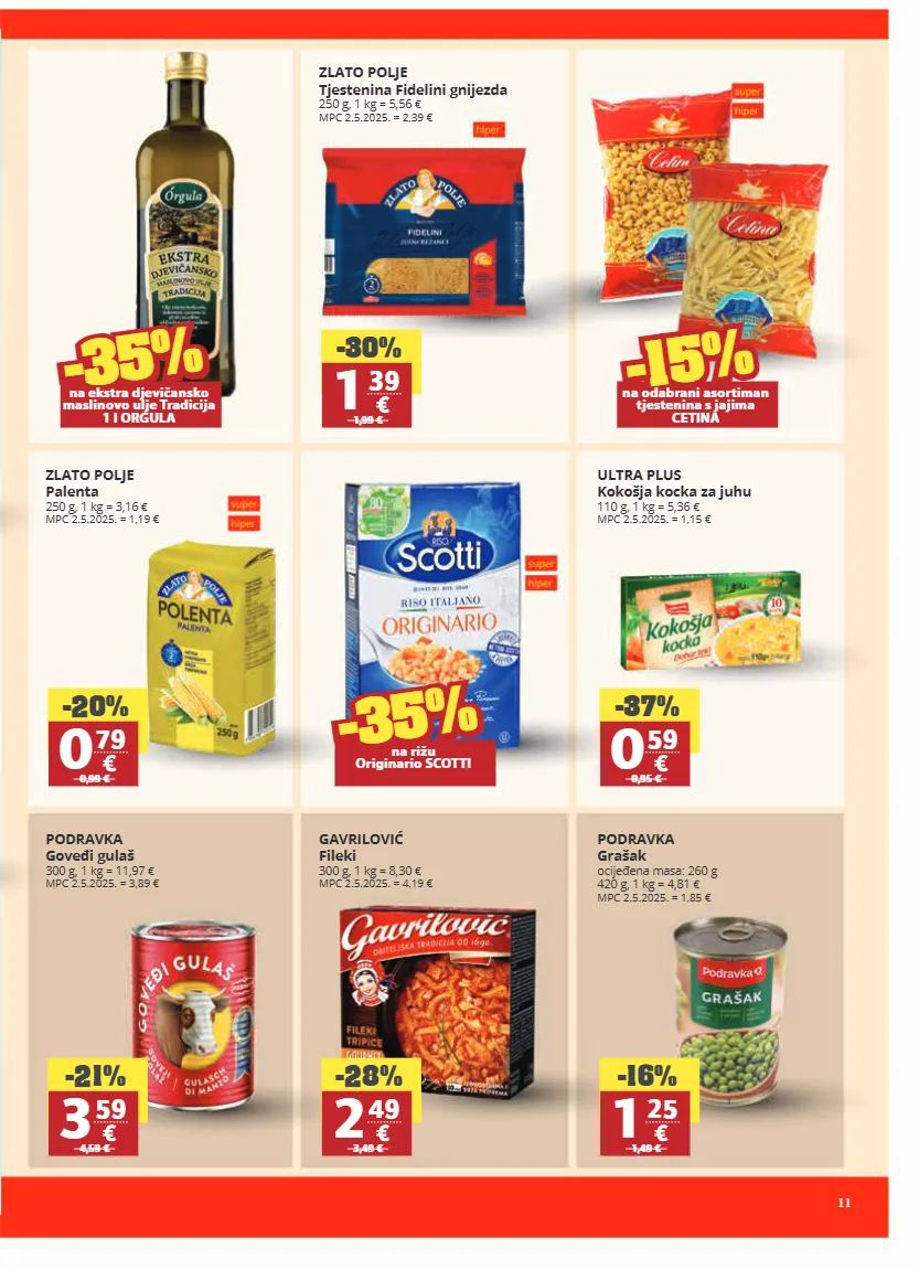 11 zlato polje tjestenina fidelini gnijezda 250 g, 1 kg = 5,56 € mpc 2.5.2025. = 2,39 € zlato polje palenta 250 g, 1 kg = 3,16 € mpc 2.5.2025. = 1,19 € podravka goveđi gulaš 300 g, 1 kg = 11,97 € mpc 2.5.2025. = 3,89 € gavrilović fileki 300 g, 1 kg = 8,30 € mpc 2.5.2025. = 4,19 € ultra plus kokošja kocka za juhu 110 g, 1 kg = 5,36 € mpc 2.5.2025. = 1,15 € -30% 1 39 1,99 € -20% 0 79 0,99 € -21% 3 59 4,59 € -28% 2 49 3,49 € -37% 0 59 0,95 € -25% -35% na ekstra djevičansko maslinovo ulje tradicija 1 l orgula -25% -35% na rižu originario scotti -15% -15% na odabrani asortiman tjestenina s jajima cetina podravka grašak ocijeđena masa: 260 g 420 g, 1 kg = 4,81 € mpc 2.5.2025. = 1,85 € -16% 1 25 1,49 €