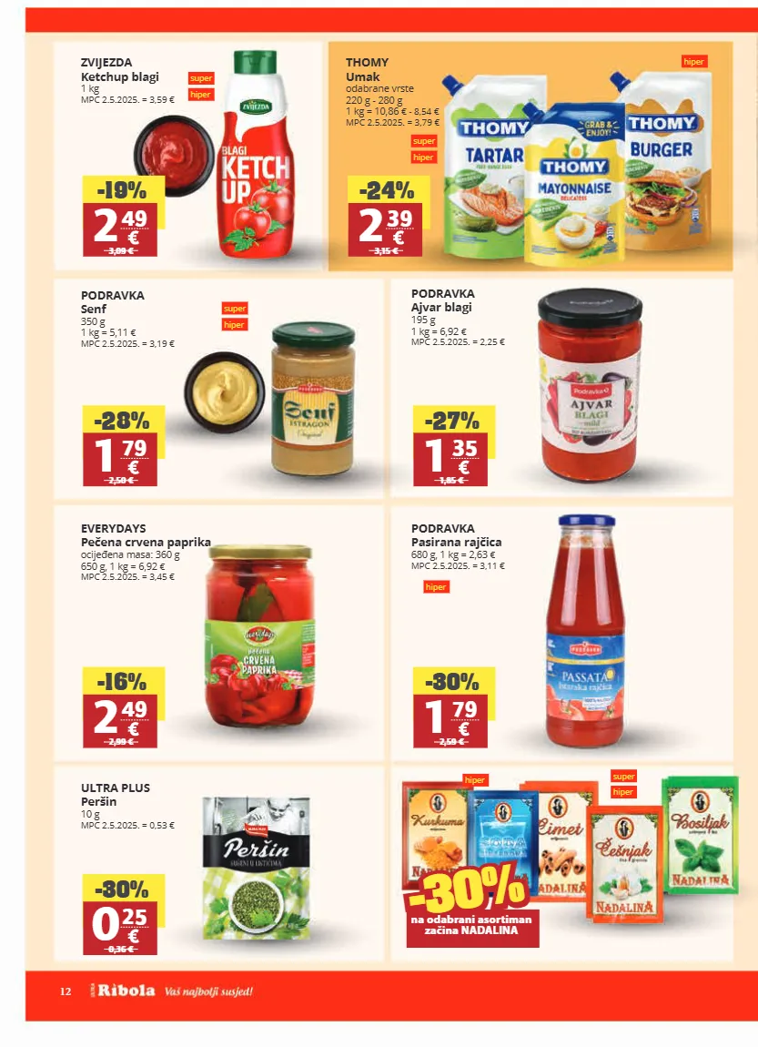 12 super hiper super hiper hiper hiper hiper super hiper super hiper zvijezda ketchup blagi 1 kg mpc 2.5.2025. = 3,59 € thomy umak odabrane vrste 220 g - 280 g 1 kg = 10,86 € - 8,54 € mpc 2.5.2025. = 3,79 € podravka senf 350 g 1 kg = 5,11 € mpc 2.5.2025. = 3,19 € podravka ajvar blagi 195 g 1 kg = 6,92 € mpc 2.5.2025. = 2,25 € everydays pečena crvena paprika ocijeđena masa: 360 g 650 g, 1 kg = 6,92 € mpc 2.5.2025. = 3,45 € podravka pasirana rajčica 680 g, 1 kg = 2,63 € mpc 2.5.2025. = 3,11 € ultra plus peršin 10 g mpc 2.5.2025. = 0,53 € -19% 2 49 3,09 € -24% 2 39 3,15 € -28% 1 79 2,50 € -16% 2 49 2,99 € -30% 1 79 2,59 € -30% 0 25 0,36 € -27% 1 35 1,85 € -20% -30% na odabrani asortiman začina nadalina
