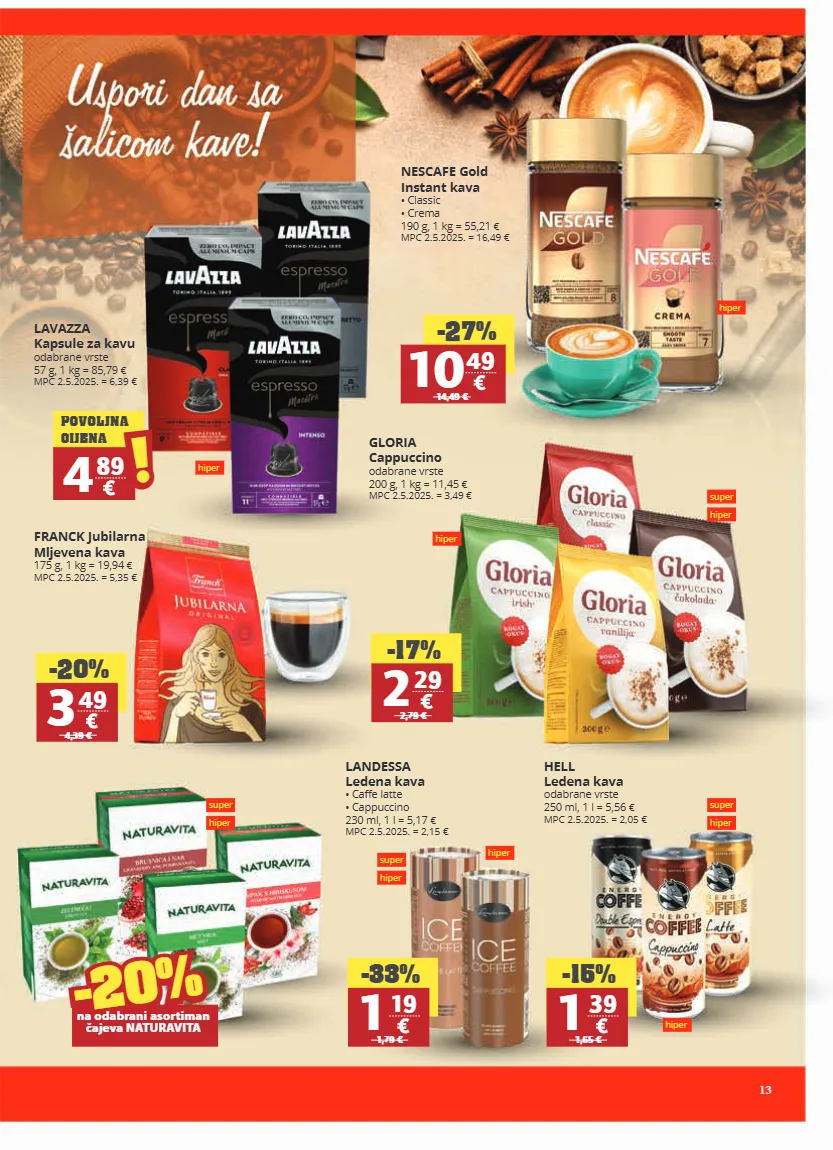 13 hiper hiper nescafe gold instant kava • classic • crema 190 g, 1 kg = 55,21 € mpc 2.5.2025. = 16,49 € franck jubilarna mljevena kava 175 g, 1 kg = 19,94 € mpc 2.5.2025. = 5,35 € lavazza kapsule za kavu odabrane vrste 57 g, 1 kg = 85,79 € mpc 2.5.2025. = 6,39 € gloria cappuccino odabrane vrste 200 g, 1 kg = 11,45 € mpc 2.5.2025. = 3,49 € landessa ledena kava • caffe latte • cappuccino 230 ml, 1 l = 5,17 € mpc 2.5.2025. = 2,15 € hell ledena kava odabrane vrste 250 ml, 1 l = 5,56 € mpc 2.5.2025. = 2,05 € -20% 3 49 4,39 € -33% 1 19 1,79 € -15% 1 39 1,65 € -17% 2 29 2,79 € -27% 10 49 14,49 € -20% -20% na odabrani asortiman čajeva naturavita super hiper super hiper super hiper super hiper hiper hiper hiper 4 89 ! ! povoljna cijena