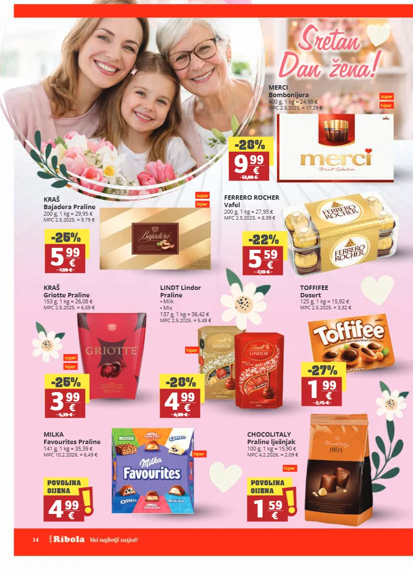 14 super hiper super hiper super hiper hiper hiper hiper merci bombonijera 400 g, 1 kg = 24,98 € mpc 2.5.2025. = 17,29 € kraš bajadera praline 200 g, 1 kg = 29,95 € mpc 2.5.2025. = 9,79 € ferrero rocher vafel 200 g, 1 kg = 27,95 € mpc 2.5.2025. = 8,39 € milka favourites praline 141 g, 1 kg = 35,39 € mpc 10.2.2026. = 6,49 € kraš griotte praline 153 g, 1 kg = 26,08 € mpc 2.5.2025. = 6,59 € toffifee desert 125 g, 1 kg = 15,92 € mpc 2.5.2025. = 3,32 € chocolitaly praline lješnjak 100 g, 1 kg = 15,90 € mpc 4.2.2026. = 2,09 € lindt lindor praline • milk • mix 137 g, 1 kg = 36,42 € mpc 2.5.2025. = 5,49 € -28% 9 99 13,99 € -25% 5 99 7,99 € -22% 5 59 7,19 € -25% 3 99 5,39 € -28% 4 99 6,99 € -27% 1 99 2,75 € 4 99 ! ! povoljna cijena 1 59 ! ! povoljna cijena sretan dan žena!