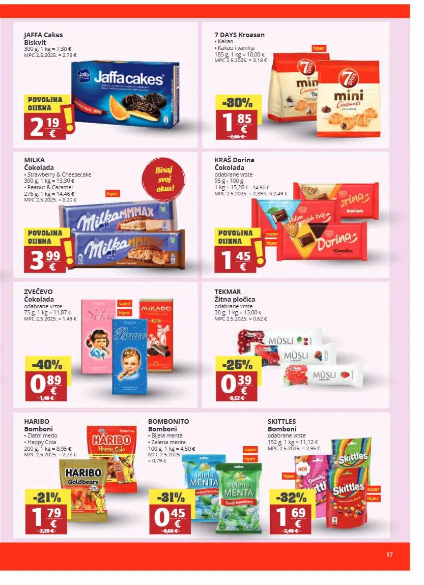 17 -30% 1 85 2,65 € -40% 0 89 1,49 € -25% 0 39 0,52 € -21% 1 79 2,29 € -32% 1 69 2,49 € -31% 0 45 0,66 € jaffa cakes biskvit 300 g, 1 kg = 7,30 € mpc 2.5.2025. = 2,79 € zvečevo čokolada odabrane vrste 75 g, 1 kg = 11,87 € mpc 2.5.2025. = 1,49 € tekmar žitna pločica odabrane vrste 30 g, 1 kg = 13,00 € mpc 2.5.2025. = 0,62 € haribo bomboni • zlatni medo • happy cola 200 g, 1 kg = 8,95 € mpc 2.5.2025. = 2,78 € bombonito bomboni • bijela menta • zelena menta 100 g, 1 kg = 4,50 € mpc 2.5.2025. = 0,79 € skittles bomboni odabrane vrste 152 g, 1 kg = 11,12 € mpc 2.5.2025. = 2,95 € 7 days kroasan • kakao • kakao i vanilija 185 g, 1 kg = 10,00 € mpc 2.5.2025. = 3,18 € kraš dorina čokolada odabrane vrste 95 g - 100 g 1 kg = 15,26 € - 14,50 € mpc 2.5.2025. = 2,39 € ili 2,49 € milka čokolada • strawberry & cheesecake 300 g, 1 kg = 13,30 € • peanut & caramel 276 g, 1 kg = 14,46 € mpc 2.5.2025. = 8,20 € 2 19 ! ! povoljna cijena 1 45 ! ! povoljna cijena 3 99 ! ! povoljna cijena biraj svoj okus! super hiper super hiper super hiper super hiper super hiper super hiper super hiper super hiper hiper hiper hiper