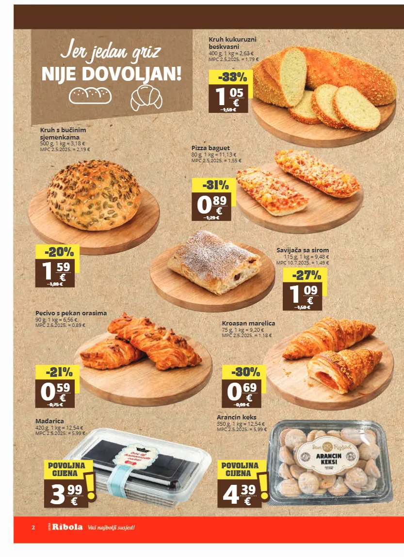 2 jer jedan griz nije dovoljan! kruh s bučinim sjemenkama 500 g, 1 kg = 3,18 € mpc 2.5.2025. = 2,19 € pecivo s pekan orasima 90 g, 1 kg = 6,56 € mpc 2.5.2025. = 0,89 € kroasan marelica 75 g, 1 kg = 9,20 € mpc 2.5.2025. = 1,18 € mađarica 420 g, 1 kg = 12,54 € mpc 2.5.2025. = 5,99 € arancin keks 350 g, 1 kg = 12,54 € mpc 2.5.2025. = 5,99 € kruh kukuruzni beskvasni 400 g, 1 kg = 2,63 € mpc 2.5.2025. = 1,79 € pizza baguet 80 g, 1 kg = 11,13 € mpc 2.5.2025. = 1,55 € savijača sa sirom 115 g, 1 kg = 9,48 € mpc 10.7.2025. = 1,49 € 3 99 povoljna cijena ! ! 4 39 povoljna cijena ! ! -20% 1 59 1,99 € -21% 0 59 0,75 € -30% 0 69 0,99 € -33% 1 05 1,59 € -31% 0 89 1,29 € -27% 1 09 1,50 €