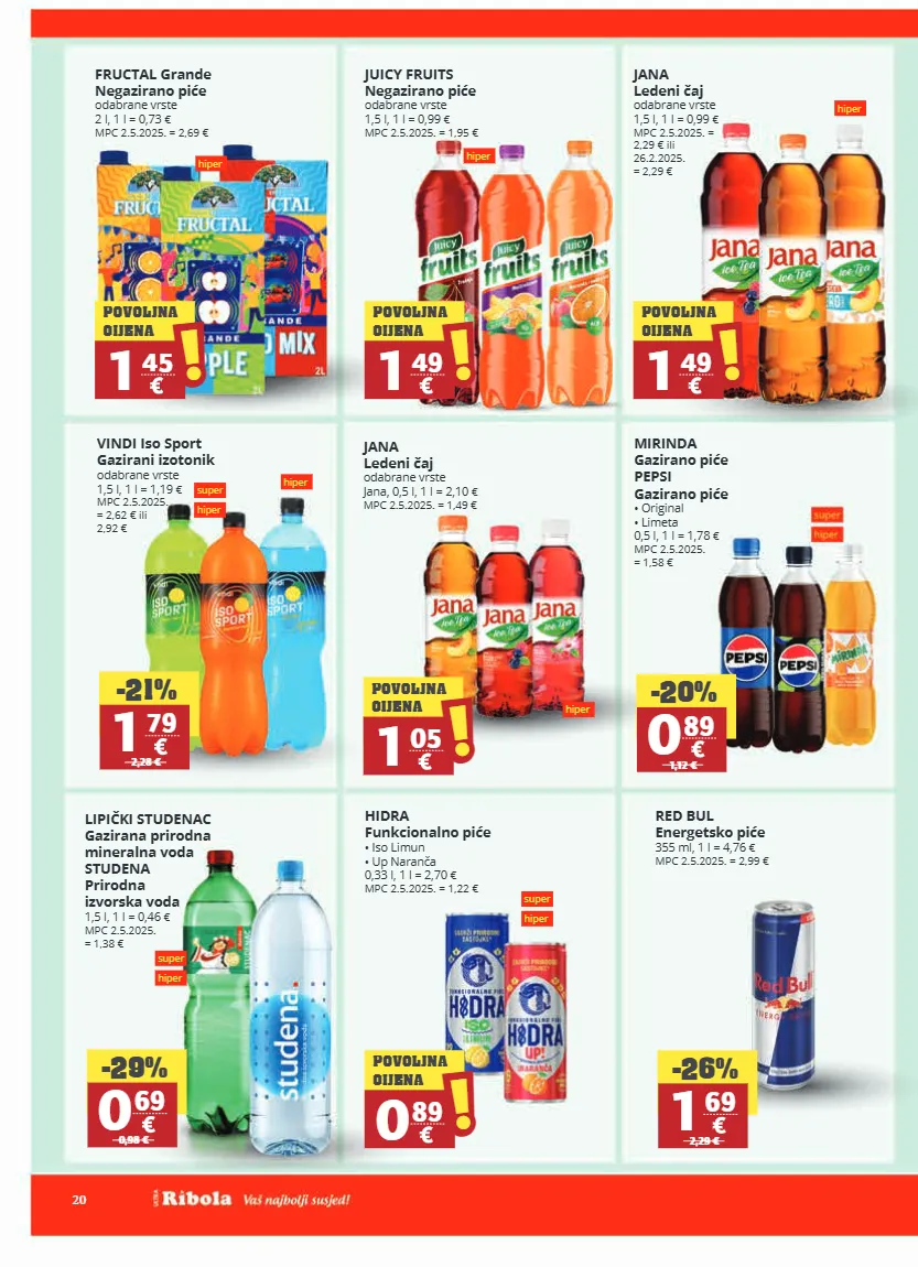 20 fructal grande negazirano piće odabrane vrste 2 l, 1 l = 0,73 € mpc 2.5.2025. = 2,69 € juicy fruits negazirano piće odabrane vrste 1,5 l, 1 l = 0,99 € mpc 2.5.2025. = 1,95 € vindi iso sport gazirani izotonik odabrane vrste 1,5 l, 1 l = 1,19 € mpc 2.5.2025. = 2,62 € ili 2,92 € hidra funkcionalno piće • iso limun • up naranča 0,33 l, 1 l = 2,70 € mpc 2.5.2025. = 1,22 € red bul energetsko piće 355 ml, 1 l = 4,76 € mpc 2.5.2025. = 2,99 € jana ledeni čaj odabrane vrste 1,5 l, 1 l = 0,99 € mpc 2.5.2025. = 2,29 € ili 26.2.2025. = 2,29 € mirinda gazirano piće pepsi gazirano piće • original • limeta 0,5 l, 1 l = 1,78 € mpc 2.5.2025. = 1,58 € -20% 0 89 1,12 € -21% 1 79 2,28 € -26% 1 69 2,29 € 1 49 ! ! povoljna cijena 1 45 ! ! povoljna cijena 1 49 ! ! povoljna cijena 0 89 ! ! povoljna cijena jana ledeni čaj odabrane vrste jana, 0,5 l, 1 l = 2,10 € mpc 2.5.2025. = 1,49 € 1 05 ! ! povoljna cijena hiper hiper hiper lipički studenac gazirana prirodna mineralna voda studena prirodna izvorska voda 1,5 l, 1 l = 0,46 € mpc 2.5.2025. = 1,38 € -29% 0 69 0,98 € super hiper super hiper super hiper hiper hiper