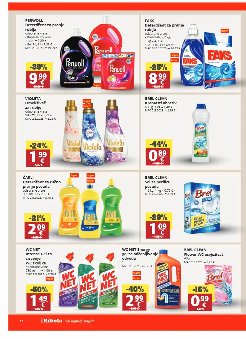 22 violeta omekšivač za rublje odabrane vrste 900 ml, 1 l = 2,21 € mpc 2.5.2025. = 3,25 € wc net intense gel za čišćenje wc školjke odabrane vrste 750 ml, 1 l = 1,99 € mpc 2.5.2025. = 3,78 € brel clean flower wc osvježivač 40 g mpc 2.5.2025. = 1,75 € brel clean kremasti abraziv 600 g, 1 kg = 1,48 € mpc 2.5.2025. = 2,15 € faks deterdžent za pranje rublja odabrane vrste • praškasti, 2,2 kg, 1 kg = 4,09 € • gel, 1,8 l, 1 l = 4,99 € mpc 17.10.2025. = 14,49 € perwoll deterdžent za pranje rublja odabrane vrste • kapsule, 35 kom 1 kom = 0,29 € • gel, 3 l, 1 l = 3,33 € mpc 2.5.2025. = 19,99 € -25% 8 99 11,99 € -24% 1 99 2,65 € brel clean sol za perilicu posuđa 1,5 kg, 1 kg = 0,73 € mpc 2.5.2025. = 2,09 € -29% 1 09 1,55 € -50% 1 49 3,02 € -16% 0 99 1,19 € -44% 0 89 1,59 € -39% 9 99 16,49 € super hiper super hiper super hiper čarli deterdžent za ručno pranje posuđa odabrane vrste 900 ml, 1 l = 2,32 € mpc 2.5.2025. = 3,45 € -21% 2 09 2,65 € super hiper hiper wc net energy gel za odčepljivanje odvoda 1 l mpc 2.5.2025. = 6,25 € -40% 2 99 5,01 € hiper hiper hiper