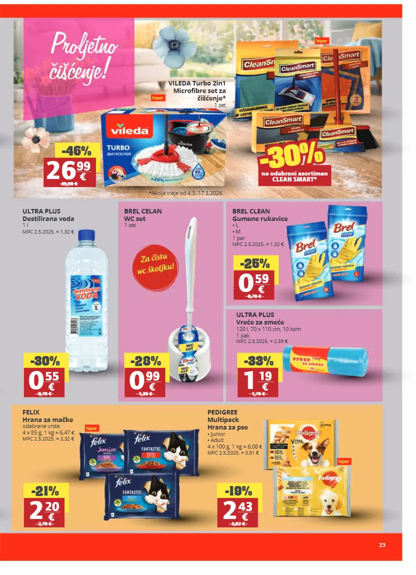23 vileda turbo 2in1 microfibre set za čišćenje* 1 set -25% 0 59 0,79 € -28% 0 99 1,39 € -30% 0 55 0,79 € -33% 1 19 1,79 € -46% 26 99 49,99 € -30% -30% na odabrani asortiman clean smart* brel clean gumene rukavice • l • m 1 par mpc 2.5.2025. = 1,32 € ultra plus vreće za smeće 120 l, 70 x 110 cm, 10 kom 1 pak mpc 2.5.2025. = 2,39 € brel celan wc set 1 set ultra plus destilirana voda 1 l mpc 2.5.2025. = 1,32 € *akcija traje od 4.3.-17.3.2026. hiper hiper -19% 2 43 3,02 € pedigree multipack hrana za pse • junior • adult 4 x 100 g, 1 kg = 6,08 € mpc 2.5.2025. = 3,81 € hiper -21% 2 20 2,79 € felix hrana za mačke odabrane vrste 4 x 85 g, 1 kg = 6,47 € mpc 2.5.2025. = 3,32 € hiper