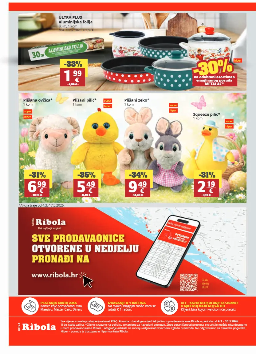 plaćanja karticama kartice koje prihvaćamo: visa, maestro, master card, diners izdavanje r-1 računa na svakoj blagajni može vam se izdati r-1 račun. dcc – kartično plaćanje za strance u njihovoj matičnoj valuti klijent bira kojom valutom će plaćati. sve cijene su maloprodajne (uračunat pdv). ponuda iz kataloga vrijedi isključivo u prodavaonicama ribola u periodu od 4.3. - 10.3.2026. ili do isteka zaliha. *cijene iskazane na polici su umanjene za navedeni postotak. zbog ograničenosti prostora, sve akcije možda nisu dostupne u svim prodavaonicama ribola. fotografije artikala ne moraju odgovarati stvarnom izgledu proizvoda. ne odgovaramo za tiskarske pogreške. hiper – ponuda je dostupna u hipermarketu ribola. -33% 1 99 2,99 € -31% 6 99 10,19 € -35% 5 49 8,49 € -34% 9 49 14,49 € -31% 2 19 3,19 € ultra plus aluminijska folija 30 m, 1 kom mpc 10.12.2026. = 3,59 € plišana ovčica* 1 kom plišani pilić* 1 kom plišani zeko* 1 kom squeeze pilić* 1 kom -30% -30% na odabrani asortiman emajliranog posuđa metalac* *akcija traje od 4.3.-17.3.2026. super hiper super hiper super hiper super hiper hiper