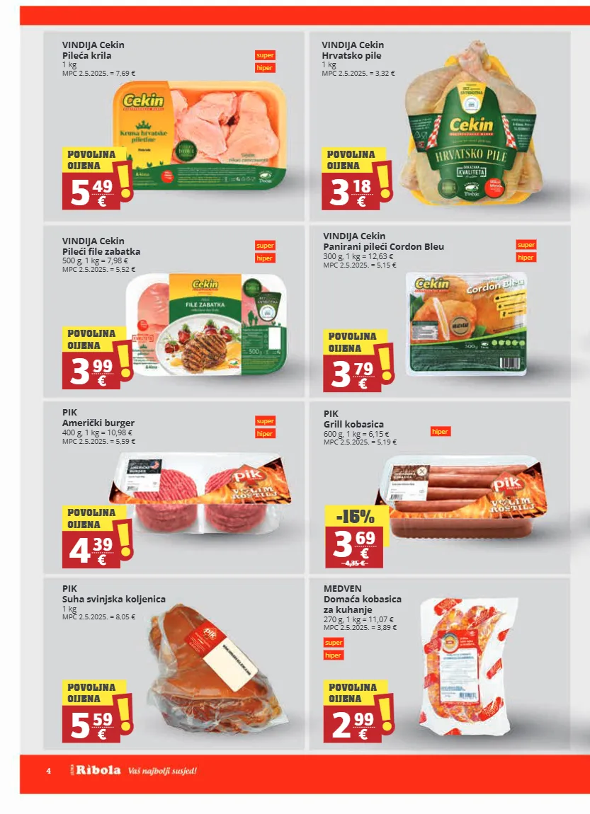 4 vindija cekin hrvatsko pile 1 kg mpc 2.5.2025. = 3,32 € vindija cekin pileća krila 1 kg mpc 2.5.2025. = 7,69 € vindija cekin pileći file zabatka 500 g, 1 kg = 7,98 € mpc 2.5.2025. = 5,52 € vindija cekin panirani pileći cordon bleu 300 g, 1 kg = 12,63 € mpc 2.5.2025. = 5,15 € pik američki burger 400 g, 1 kg = 10,98 € mpc 2.5.2025. = 5,59 € pik suha svinjska koljenica 1 kg mpc 2.5.2025. = 8,05 € 3 18 ! ! povoljna cijena 5 49 ! ! povoljna cijena 3 99 ! ! povoljna cijena 4 39 ! ! povoljna cijena 5 59 ! ! povoljna cijena 3 79 ! ! povoljna cijena pik grill kobasica 600 g, 1 kg = 6,15 € mpc 2.5.2025. = 5,19 € -15% 3 69 4,35 € super hiper super hiper hiper super hiper medven domaća kobasica za kuhanje 270 g, 1 kg = 11,07 € mpc 2.5.2025. = 3,89 € 2 99 ! ! povoljna cijena super hiper super hiper