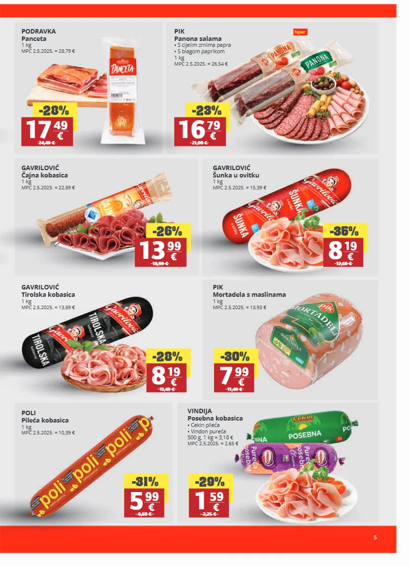 5 podravka panceta 1 kg mpc 2.5.2025. = 28,79 € -28% 17 49 24,49 € pik panona salama • s cijelim zrnima papra • s blagom paprikom 1 kg mpc 2.5.2025. = 26,54 € gavrilović čajna kobasica 1 kg mpc 2.5.2025. = 22,89 € gavrilović šunka u ovitku 1 kg mpc 2.5.2025. = 15,39 € gavrilović tirolska kobasica 1 kg mpc 2.5.2025. = 13,89 € pik mortadela s maslinama 1 kg mpc 2.5.2025. = 13,93 € poli pileća kobasica 1 kg mpc 2.5.2025. = 10,39 € -23% 16 79 21,99 € -26% 13 99 18,99 € -35% 8 19 12,69 € -28% 8 19 11,49 € -30% 7 99 11,49 € -31% 5 99 8,69 € hiper vindija posebna kobasica • cekin pileća • vindon pureća 500 g, 1 kg = 3,18 € mpc 2.5.2025. = 2,65 € -29% 1 59 2,25 €