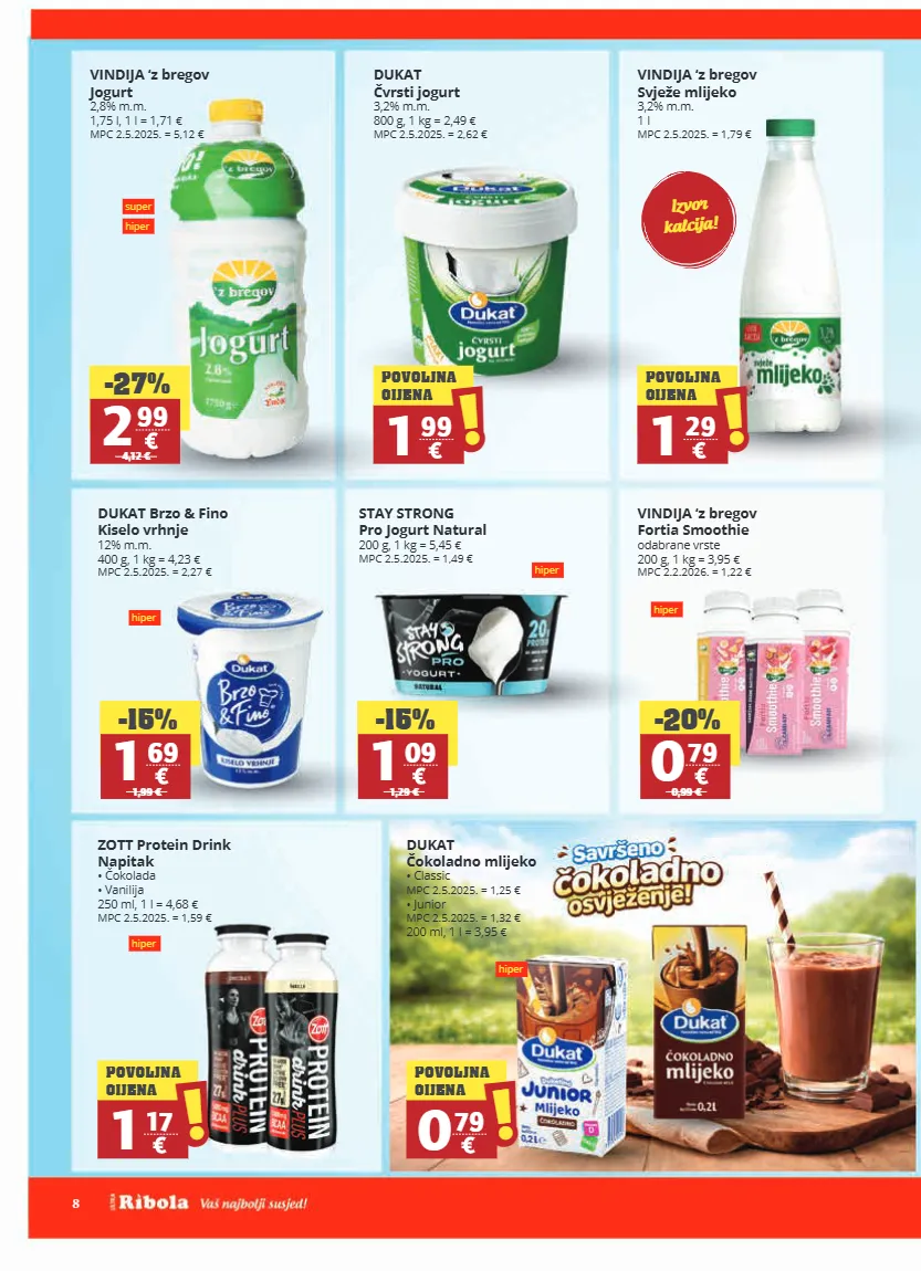 8 izvor kalcija! super hiper hiper hiper hiper hiper hiper vindija ‘z bregov jogurt 2,8% m.m. 1,75 l, 1 l = 1,71 € mpc 2.5.2025. = 5,12 € dukat čvrsti jogurt 3,2% m.m. 800 g, 1 kg = 2,49 € mpc 2.5.2025. = 2,62 € vindija ‘z bregov svježe mlijeko 3,2% m.m. 1 l mpc 2.5.2025. = 1,79 € dukat brzo & fino kiselo vrhnje 12% m.m. 400 g, 1 kg = 4,23 € mpc 2.5.2025. = 2,27 € stay strong pro jogurt natural 200 g, 1 kg = 5,45 € mpc 2.5.2025. = 1,49 € vindija ‘z bregov fortia smoothie odabrane vrste 200 g, 1 kg = 3,95 € mpc 2.2.2026. = 1,22 € zott protein drink napitak • čokolada • vanilija 250 ml, 1 l = 4,68 € mpc 2.5.2025. = 1,59 € dukat čokoladno mlijeko • classic mpc 2.5.2025. = 1,25 € • junior mpc 2.5.2025. = 1,32 € 200 ml, 1 l = 3,95 € -27% 2 99 4,12 € -15% 1 69 1,99 € -15% 1 09 1,29 € -20% 0 79 0,99 € 1 99 ! ! povoljna cijena 1 29 ! ! povoljna cijena 1 17 ! ! povoljna cijena 0 79 ! ! povoljna cijena