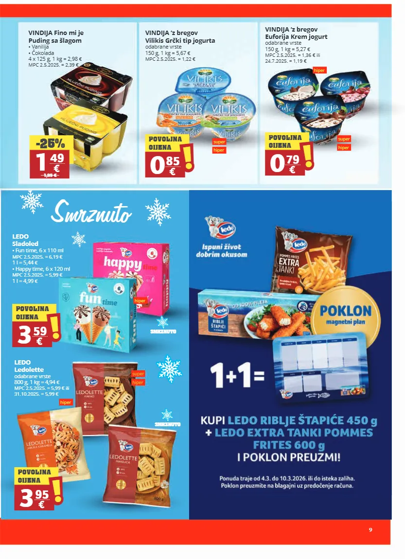 9 super hiper super hiper hiper vindija fino mi je puding sa šlagom • vanilija • čokolada 4 x 125 g, 1 kg = 2,98 € mpc 2.5.2025. = 2,39 € vindija ‘z bregov vilikis grčki tip jogurta odabrane vrste 150 g, 1 kg = 5,67 € mpc 2.5.2025. = 1,22 € vindija ‘z bregov euforija krem jogurt odabrane vrste 150 g, 1 kg = 5,27 € mpc 2.5.2025. = 1,36 € ili 24.7.2025. = 1,19 € -25% 1 49 1,99 € 0 85 ! ! povoljna cijena 0 79 ! ! povoljna cijena hiper ledo sladoled • fun time, 6 x 110 ml mpc 2.5.2025. = 6,19 € 1 l = 5,44 € • happy time, 6 x 120 ml mpc 2.5.2025. = 5,99 € 1 l = 4,99 € 3 59 ! ! povoljna cijena hiper ledo ledolette odabrane vrste 800 g, 1 kg = 4,94 € mpc 2.5.2025. = 5,99 € ili 31.10.2025. = 5,99 € 3 95 ! ! povoljna cijena smrznuto smrznuto smrznuto