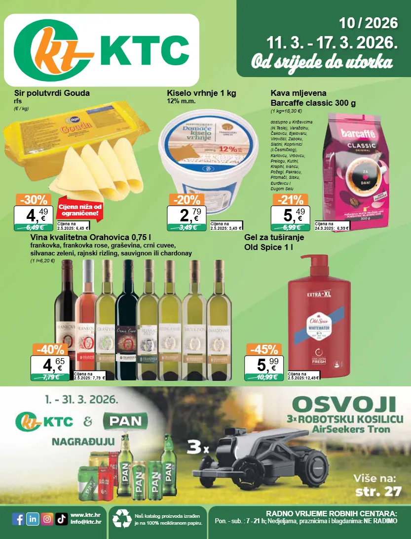 10 / 2026 11. 3. - 17. 3. 2026. od srijede do utorka naš katalog proizvoda izrađen je na 100% recikliranom papiru. radno vrijeme robnih centara: pon. - sub. : 7 - 21 h ; nedjeljama, praznicima i blagdanima : ne radimo www.ktc.hr info@ktc.hr dostupno u križevcima (n.tesle), varaždinu, čakovcu, bjelovaru, virovitici, zaboku, slatini, koprivnici (i.česmičkog), karlovcu, vrbovcu, prelogu, kutini, krapini, ivancu, požegi, pakracu, pitomači, sisku, đurđevcu i dugom selu kava mljevena barcaffe classic 300 g (1 kg=18,30 €) cijena na 24.9.2025: 6,99 € -21% 6,99 € 5 , 49 € vina kvalitetna orahovica 0,75 l frankovka, frankovka rose, graševina, crni cuvee, silvanac zeleni, rajnski rizling, sauvignon ili chardonay (1 l=6,20 €) cijena na 2.5.2025: 7,79 € -40% 7,79 € 4 , 65 € gel za tuširanje old spice 1 l cijena na 2.5.2025:12,49 € -45% 10,99 € 5 , 99 € cijena niža od ograničene! sir polutvrdi gouda rfs (€ / kg) cijena na 2.5.2025: 6,49 € -30% 6,49 € 4 , 49 € kiselo vrhnje 1 kg 12% m.m. cijena na 2.5.2025: 3,49 € -20% 3,49 € 2 , 79 €