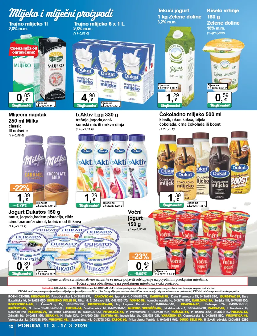 nakladnik: ktc d.d., n, tesle 18, 48260 križevci, tel: 048/628-554 u nekim prodajnim prostorima, zbog ograničenog prostora, nisu dostupni svi proizvodi iz letka . ktc d.d. zadržava pravo promjene cijena uslijed promjena cijena na tržištu | sve fotografije proizvoda su simbolične, te ne moraju odgovarati stvarnom proizvodu | ktc d.d. zadržava pravo tiskarske pogreške robni centri: bjelovar-50 , pakračka ulica 1, 043/638-871, čakovec-64 , športska 4, 040/638-271, daruvar-78 , krste frankopana 35, 043/638-380, đurđevac-59 , đure basaričeka 16, 048/628-080 grubišno polje-76 , ulica n. š. zrinskog bb, 043/639-170, ivanec-58, ivanečko naselje 1c, 042/771-870, karlovac-8a, senjska 118, 047/658-100, koprivnica-40, i. česmičkog 15, 048/628-330, koprivnica-88, trg eugena kumičića 1, 048/617-640, krapina-77, bobovje 52/c, 049/658-100, križevci-95, n. tesle 18–048/628-595, kutina-54, sisačka ulica 14, 044/660-871, mursko središće-86, tekstilna ulica 1, 040/644-230, pakrac-69, i. gundulića 1b, 034/638-970, petrinja-79, ul. ivana gundulića 14, 044/500-551, pitomača-42, p. preradovića 2, 033/638-902, požega-44, p. radića 46a, 034/638-152, prelog-62, zrinskih bb, 040/638-160, sisak-41, n. tesle 12/b, 044/660-926, slatina-43, industrijska bb, 033/638-021, varaždin-87, gospodarska 3, 042/658-850, virovitica-46, vukovarska 3a, 033/638-970, vrbovec-48, zagrebačka 48, 01/2793-242, zabok-60, prilaz janka tomića 1, 049/658-966, dugo selo-90, ii savski odvojak 12,01/688-6230 cijene u letku su informativne naravi te se može pojaviti odstupanje na pojedinim prodajnim mjestima. točna cijena objavljena je na prodajnom mjestu uz svaki proizvod. cijena niža od ograničene! trajno mlijeko 6 x 1 l 2,8% m.m. (1 l=0,83 €) cijena na 2.5.2025: 6,12 € birajte mudro! 4 , 98 € b.aktiv lgg 330 g trešnja,jagoda,acai- šumski mix ili mrkva-dinja (1 kg=3,91 €) cijena na 2.5.2025: 1,29 € birajte mudro! 1 , 29 € jogurt dukatos 150 g natur, jagoda,badem pistacija,.ribiz cimet,naranča cimet, kolač med ili kava (1 kg=5,93 €) cijena na 2.5.2025: 0,89 € birajte mudro! 0 , 89 € čokoladno mlijeko 500 ml klasik, okus keksa, bijela čokolada, crna čokolada ili boost (1 l=2,78 €) cijena na 2.5.2025: 1,39 € birajte mudro! 1 , 39 € trajno mlijeko 1l 2,8% m.m. cijena na 2.5.2025: 0,94 € birajte mudro! 0 , 85 € voćni jogurt 150 g (1 kg=3,00 €) cijena na 2.5.2025: 0,65 € -23% 0,59 € 0 , 45 € mliječni napitak 250 ml milka classic ili noisette (1 l=5,56 €) cijena na 2.5.2025: 1,49 € -22% 1,79 € 1 , 39 € tekući jogurt 1 kg zelene doline 3,2% m.m. cijena na 2.5.2025: 1,29 € birajte mudro! 1 , 29 € kiselo vrhnje 180 g zelene doline 18% m.m. (1 kg=3,28 €) cijena na 2.5.2025: 0,59 € birajte mudro! 0 , 59 € 12 mlijeko i mliječni proizvodi ponuda 11. 3. - 17. 3. 2026.