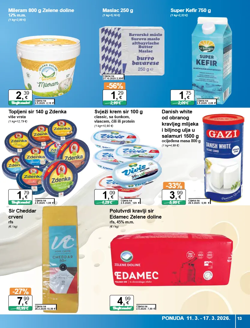super kefir 750 g (1 kg=2,33 €) cijena na 2.5.2025: 2,09 € 2,09 € 1 , 75 € svježi krem sir 100 g classic, sa šunkom, vlascem, čili ili protein (1 kg=10,90 €) cijena na 2.5.2025: 129 € 1,29 € 1 , 09 € polutvrdi kravlji sir edamec zelene doline rfs, 45% m.m. (€ / kg) cijena na 2.5.2025: 7,99 € birajte mudro! 4 , 99 € sir cheddar crveni rfs (€ / kg) cijena na 26.2.2025:10,99 € -27% 10,99 € 7 , 99 € danish white od obranog kravljeg mlijeka i biljnog ulja u salamuri 1500 g ocijeđena masa 800 g (1 kg=4,99 €) cijena na 26.5.2025: 5,99 € -33% 5,99 € 3 , 99 € mileram 800 g zelene doline 12% m.m. (1 kg=2,99 €) cijena na 2.5.2025: 2,19 € birajte mudro! 2 , 39 € maslac 250 g (1 kg=5,16 €) cijena na 21.10.2025:2,99 € -56% 2,99 € 1 , 29 € topljeni sir 140 g zdenka više vrsta (1 kg=12,79 €) cijena na 2.5.2025: 1,99 € birajte mudro! 1 , 79 € ponuda 11. 3. - 17. 3. 2026. 13