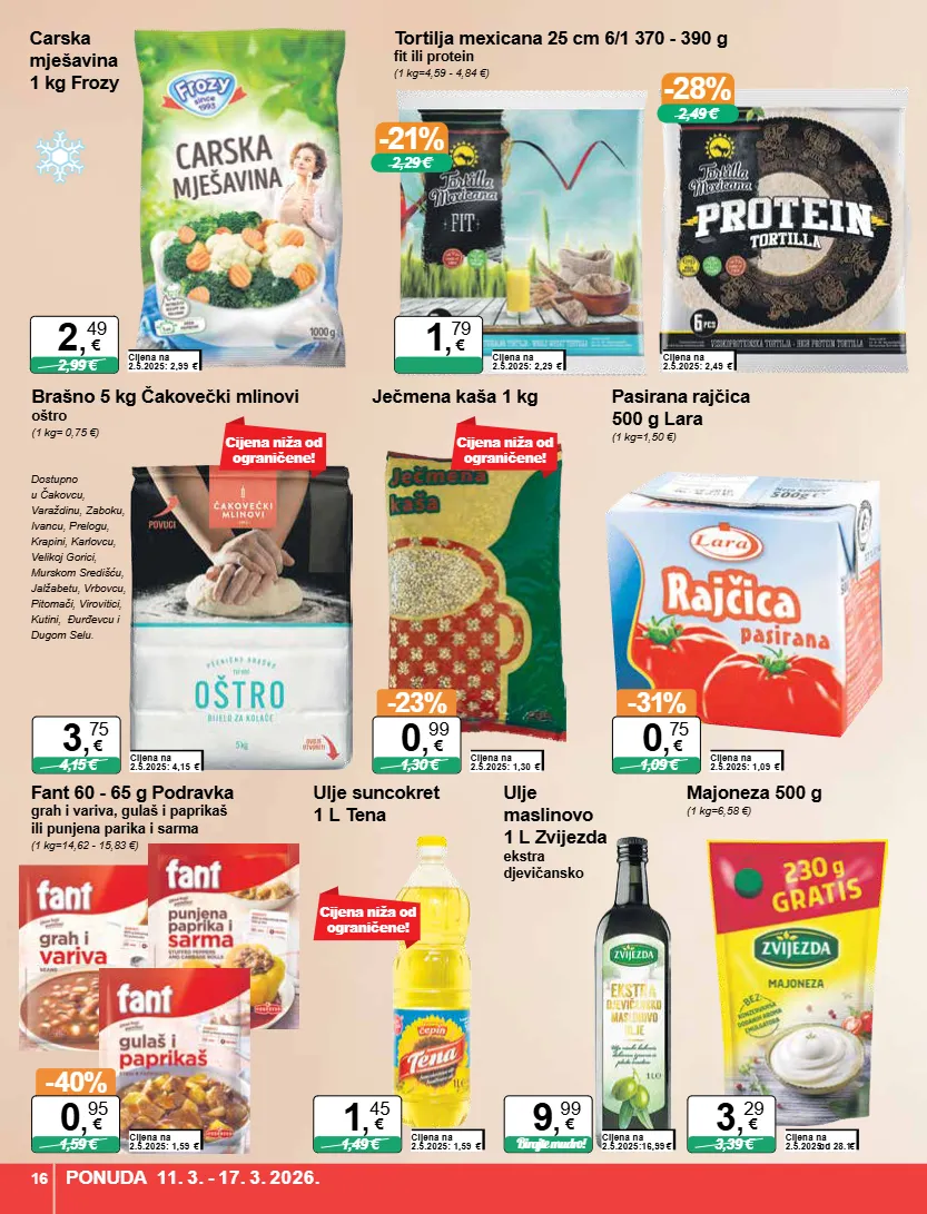 dostupno u čakovcu, varaždinu, zaboku, ivancu, prelogu, krapini, karlovcu, velikoj gorici, murskom središću, jalžabetu, vrbovcu, pitomači, virovitici, kutini, đurđevcu i dugom selu. cijena niža od ograničene! majoneza 500 g (1 kg=6,58 €) cijena na 2.5.2025: od 28.1. € 3,39 € 3 , 29 € ulje suncokret 1 l tena cijena na 2.5.2025: 1,59 € 1,49 € 1 , 45 € ulje maslinovo 1 l zvijezda ekstra djevičansko cijena na 2.5.2025:16,99 € birajte mudro! 9 , 99 € -21% 2,29 € -28% 2,49 € tortilja mexicana 25 cm 6/1 370 - 390 g fit ili protein (1 kg=4,59 - 4,84 €) cijena na 2.5.2025: 2,29 € 1 , 79 € cijena na 2.5.2025: 2,49 € carska mješavina 1 kg frozy cijena na 2.5.2025: 2,99 € 2,99 € 2 , 49 € cijena niža od ograničene! brašno 5 kg čakovečki mlinovi oštro (1 kg= 0,75 €) cijena na 2.5.2025: 4,15 € 4,15 € 3 , 75 € ječmena kaša 1 kg cijena na 2.5.2025: 1,30 € -23% 1,30 € 0 , 99 € pasirana rajčica 500 g lara (1 kg=1,50 €) cijena na 2.5.2025: 1,09 € -31% 1,09 € 0 , 75 € fant 60 - 65 g podravka grah i variva, gulaš i paprikaš ili punjena parika i sarma (1 kg=14,62 - 15,83 €) cijena na 2.5.2025: 1,59 € -40% 1,59 € 0 , 95 € cijena niža od ograničene! ponuda 11. 3. - 17. 3. 2026. 16