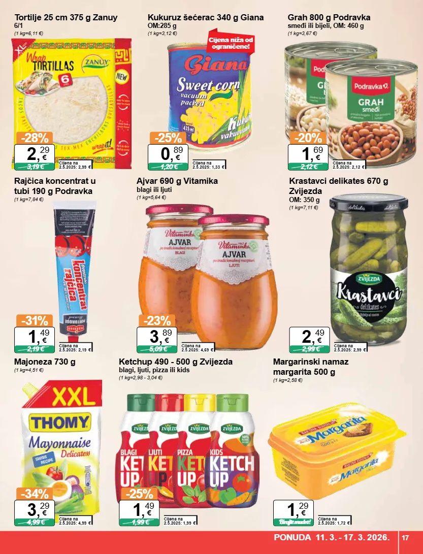 majoneza 730 g (1 kg=4,51 €) cijena na 2.5.2025: 4,99 € -34% 4,99 € 3 , 29 € margarinski namaz margarita 500 g (1 kg=2,58 €) cijena na 2.5.2025: 1,72 € birajte mudro! 1 , 29 € tortilje 25 cm 375 g zanuy 6/1 (1 kg=6,11 €) cijena na 2.5.2025: 2,99 € -28% 3,19 € 2 , 29 € cijena niža od ograničene! kukuruz šećerac 340 g giana om:285 g (1 kg=3,12 €) cijena na 2.5.2025: 1,33 € -25% 1,20 € 0 , 89 € grah 800 g podravka smeđi ili bijeli, om: 460 g (1 kg=3,67 €) cijena na 2.5.2025: 2,12 € -20% 2,12 € 1 , 69 € ajvar 690 g vitamika blagi ili ljuti (1 kg=5,64 €) cijena na 2.5.2025: 4,69 € -23% 5,09 € 3 , 89 € krastavci delikates 670 g zvijezda om: 350 g (1 kg=7,11 €) cijena na 2.5.2025: 2,99 € 2,99 € 2 , 49 € rajčica koncentrat u tubi 190 g podravka (1 kg=7,84 €) cijena na 2.5.2025: 2,19 € -31% 2,19 € 1 , 49 € ketchup 490 - 500 g zvijezda blagi, ljuti, pizza ili kids (1 kg=2,98 - 3,04 €) cijena na 2.5.2025: 1,99 € -25% 1,99 € 1 , 49 € ponuda 11. 3. - 17. 3. 2026. 17