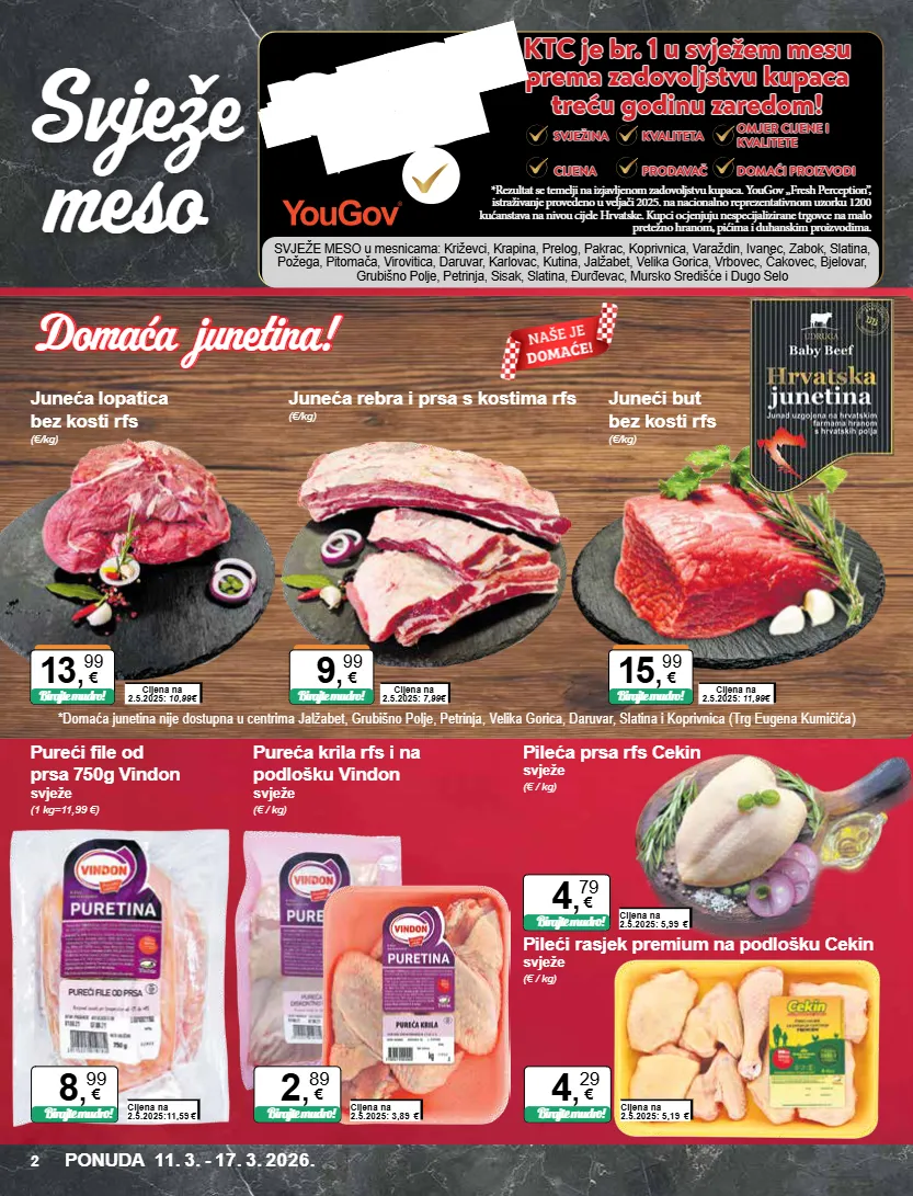 svježe meso u mesnicama: križevci, krapina, prelog, pakrac, koprivnica, varaždin, ivanec, zabok, slatina, požega, pitomača, virovitica, daruvar, karlovac, kutina, jalžabet, velika gorica, vrbovec, čakovec, bjelovar, grubišno polje, petrinja, sisak, slatina, đurđevac, mursko središće i dugo selo ktc je br. 1 u svježem mesu ktc je br. 1 u svježem mesu prema zadovoljstvu kupaca prema zadovoljstvu kupaca treću godinu zaredom! treću godinu zaredom! *rezultat se temelji na izjavljenom zadovoljstvu kupaca. yougov „fresh perception”, istraživanje provedeno u veljači 2025. na nacionalno reprezentativnom uzorku 1200 kućanstava na nivou cijele hrvatske. kupci ocjenjuju nespecijalizirane trgovce na malo pretežno hranom, pićima i duhanskim proizvodima. domaći proizvodi domaći proizvodi omjer cijene i omjer cijene i kvalitete kvalitete prodavač prodavač kvaliteta kvaliteta svježina svježina cijena cijena potvrdili kupci *domaća junetina nije dostupna u centrima jalžabet, grubišno polje, petrinja, velika gorica, daruvar, slatina i koprivnica (trg eugena kumičića) cijena na 2.5.2025: 11,99€ cijena na 2.5.2025: 10,99€ cijena na 2.5.2025: 7,99€ juneći but bez kosti rfs (€/kg) juneća lopatica bez kosti rfs (€/kg) juneća rebra i prsa s kostima rfs (€/kg) 15 , 99 € birajte mudro! 13 , 99 € birajte mudro! 9 , 99 € birajte mudro! pileća prsa rfs cekin svježe (€ / kg) cijena na 2.5.2025: 5,99 € birajte mudro! 4 , 79 € pureći file od prsa 750g vindon svježe (1 kg=11,99 €) cijena na 2.5.2025:11,59 € birajte mudro! 8 , 99 € pileći rasjek premium na podlošku cekin svježe (€ / kg) cijena na 2.5.2025: 5,19 € birajte mudro! 4 , 29 € pureća krila rfs i na podlošku vindon svježe (€ / kg) cijena na 2.5.2025: 3,89 € birajte mudro! 2 , 89 € ponuda 11. 3. - 17. 3. 2026. 2 svježe meso domaća junetina! domaća junetina! domaća junetina! domaća junetina!